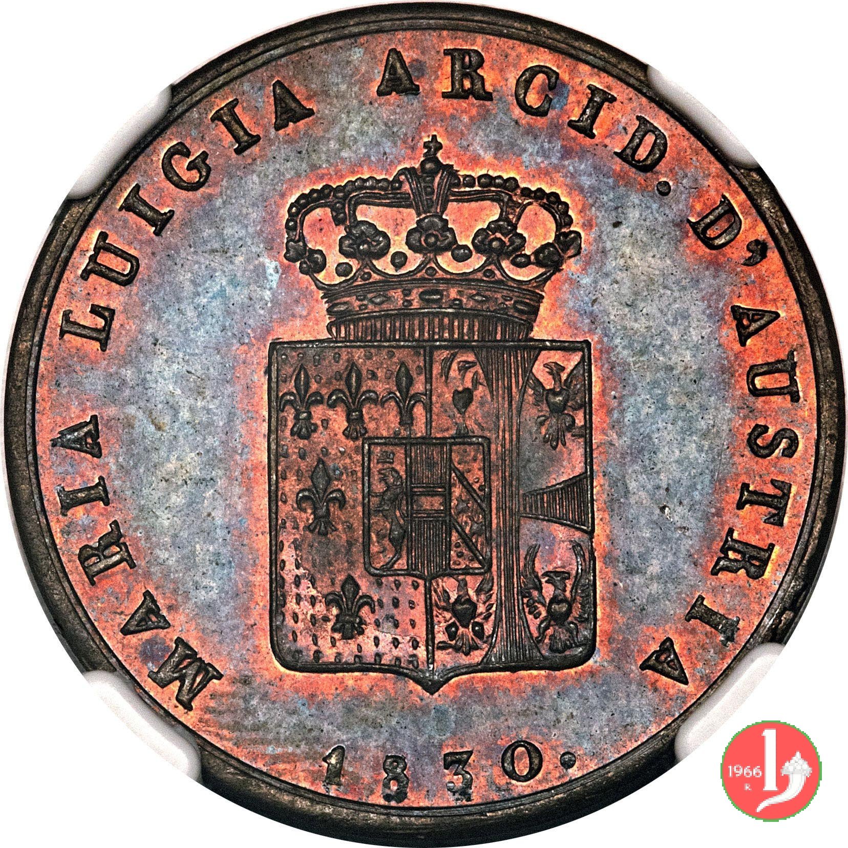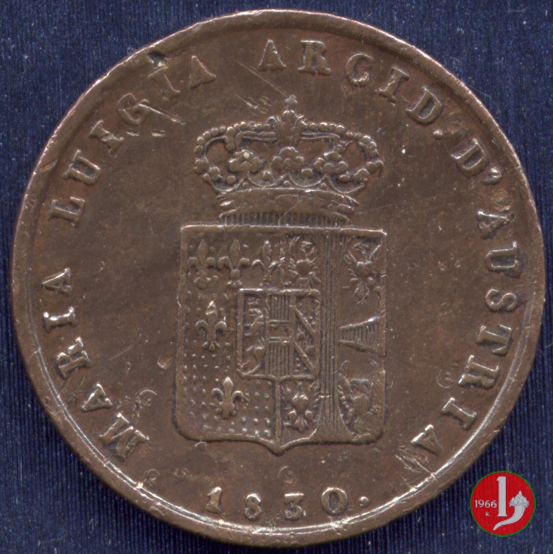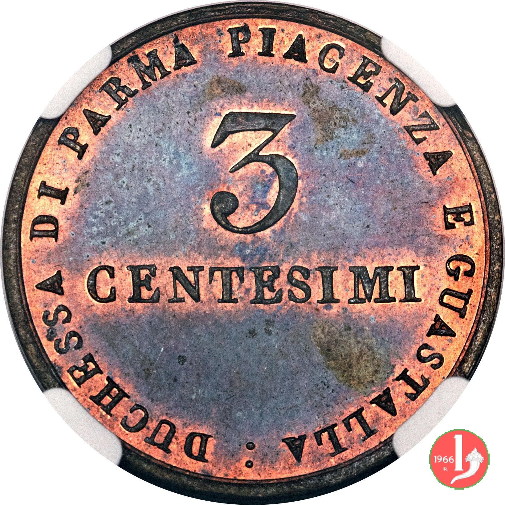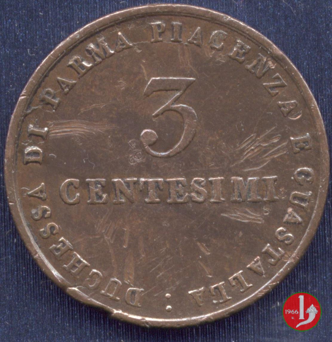Stemma della Duchessa sormontato da una corona Ducale, contornato dalla scritta: MARIA LUIGIA ARCID. D'AUSTRIA. Sotto la data: 1830. Nel campo indicazione del valore (3 CENTESIMI) su due righe, intorno: DUCHESSA DI PARMA PIACENZA E GUASTALLA :.