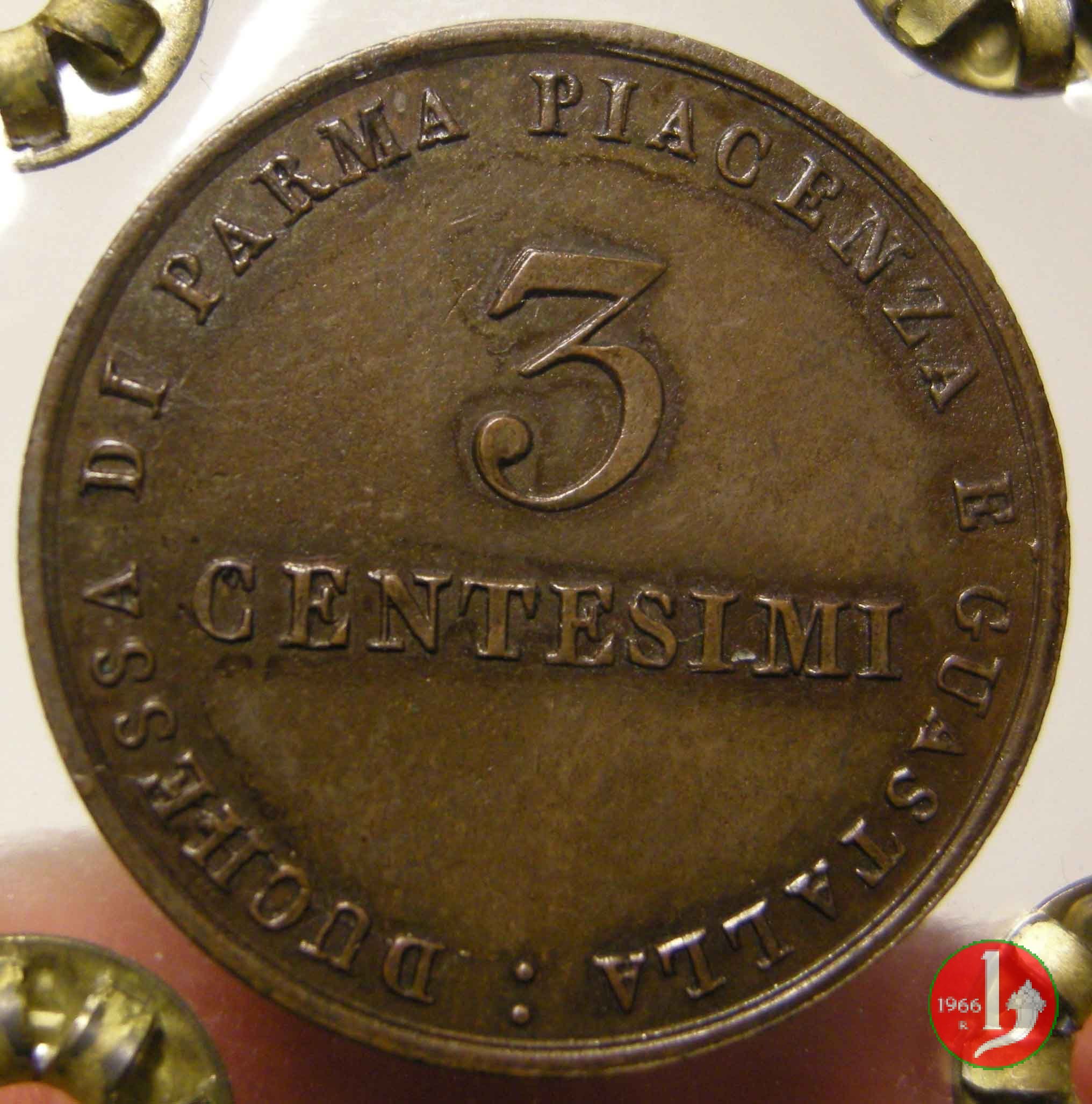 Moneta da 3 centesimi di Lira nuova. Il Ducato di Parma fu il primo stato preunitario a coniare monete utilizzando il sistema decimale.