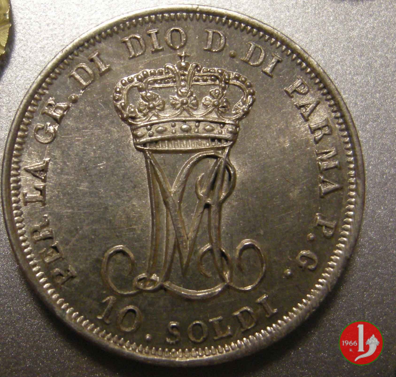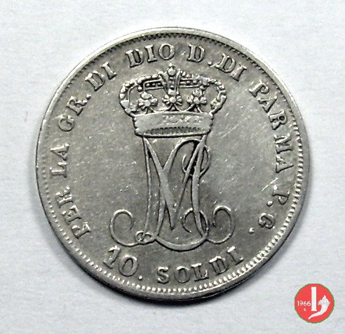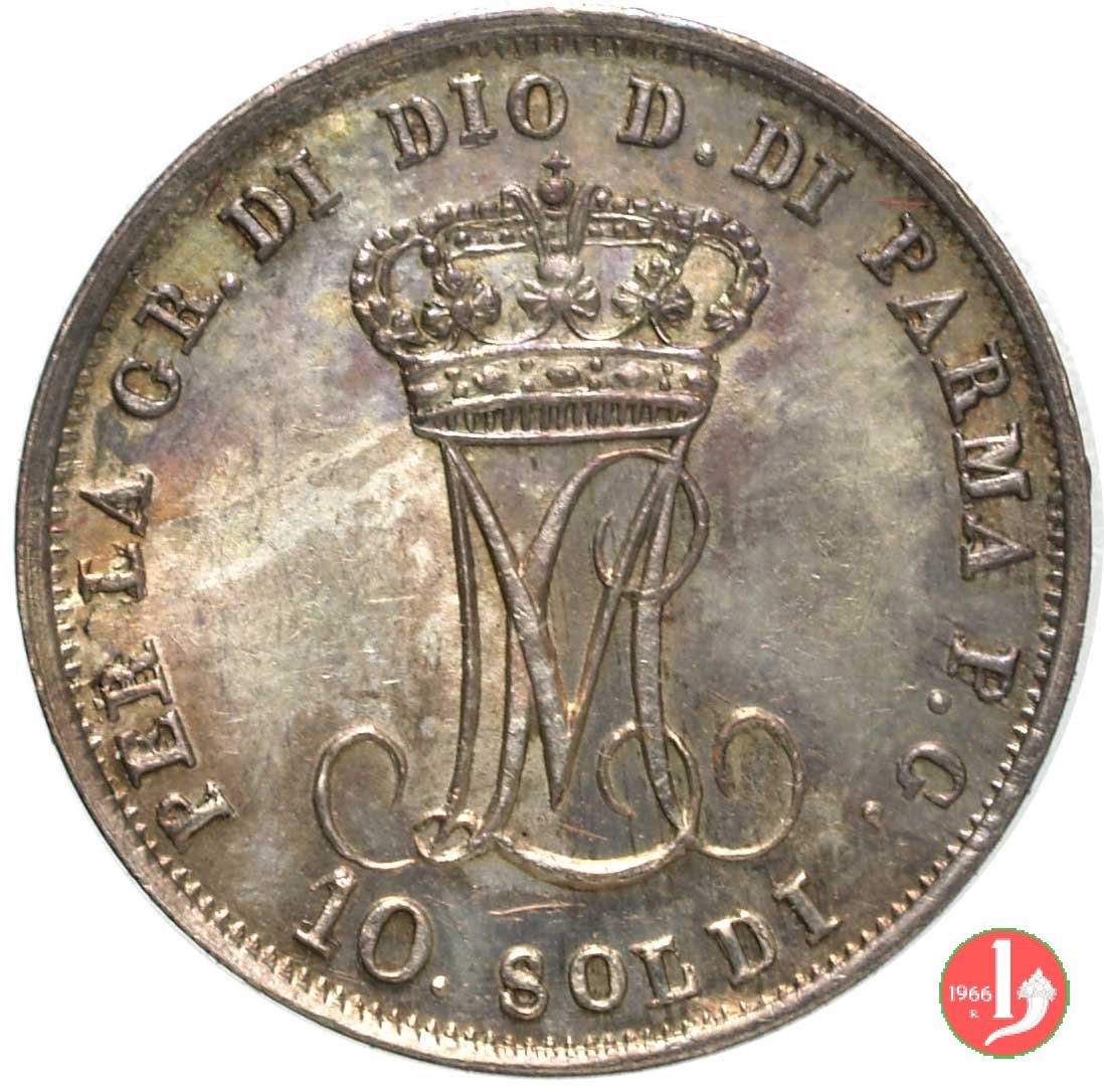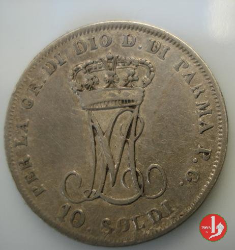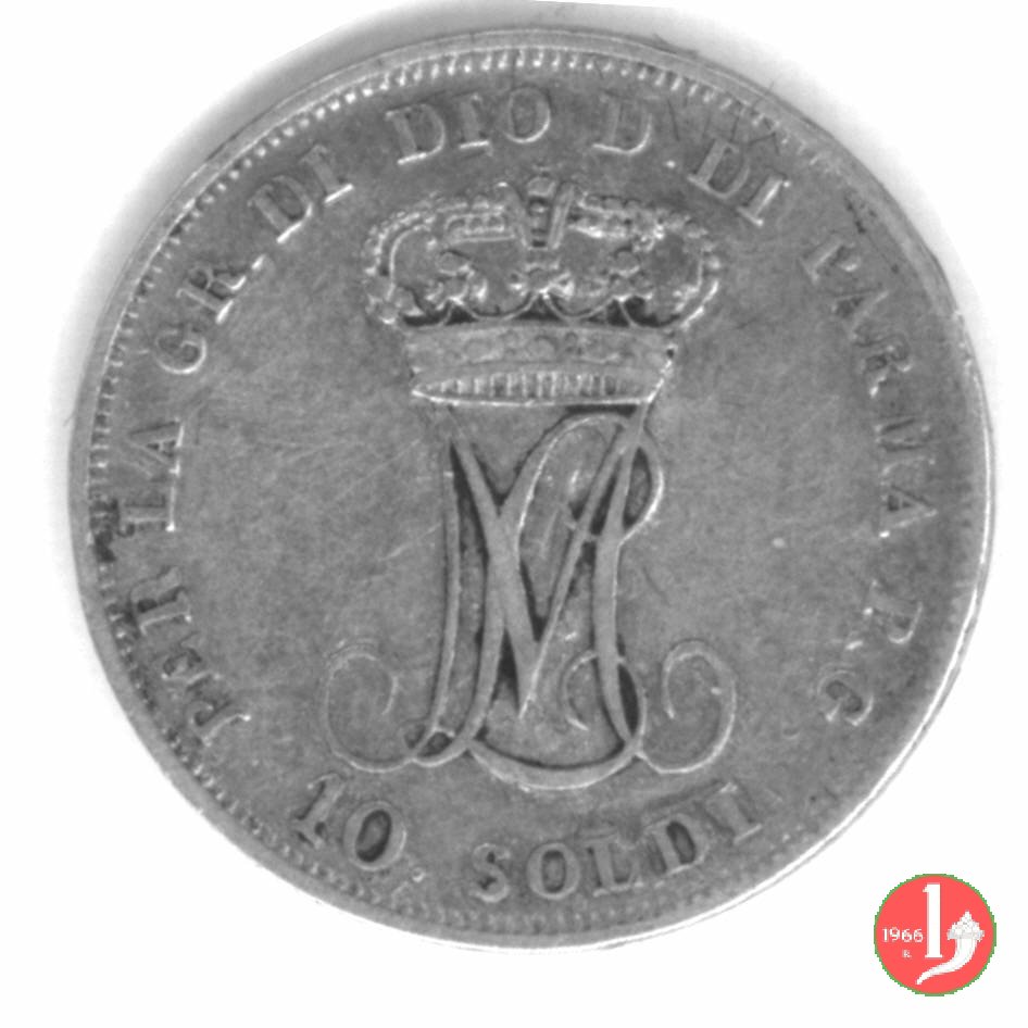 Moneta da 10 soldi, ovvero mezza lira di Parma. Il Ducato di Parma fu il primo stato preunitario a coniare monete utilizzando il sistema decimale, ciononostante per i pezzi da mezza lira ed un quarto di lira fu mantenuta la vecchia dicitura.