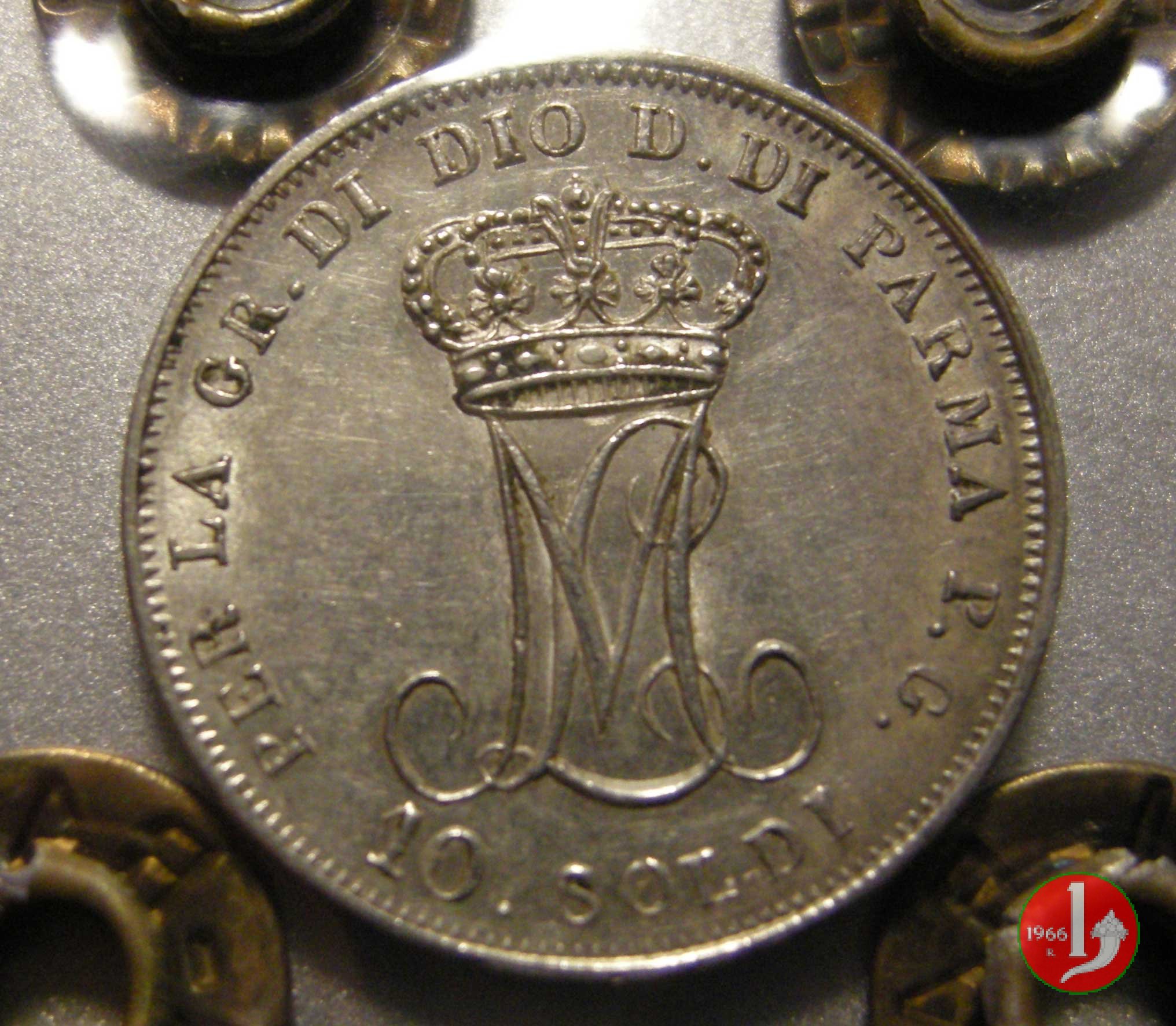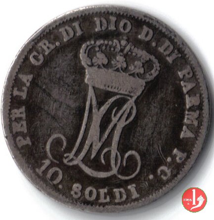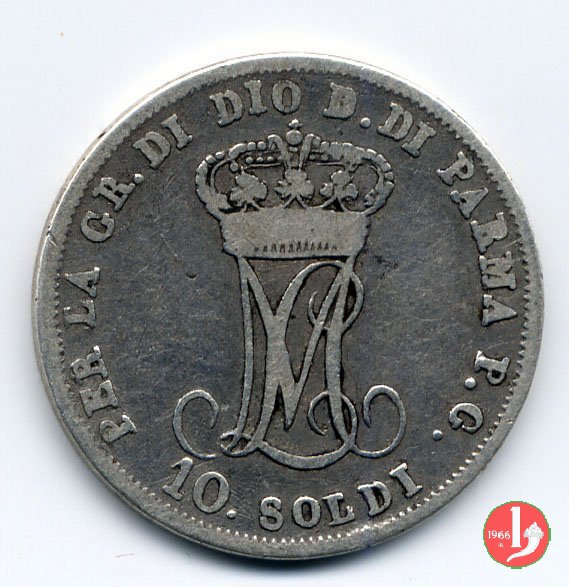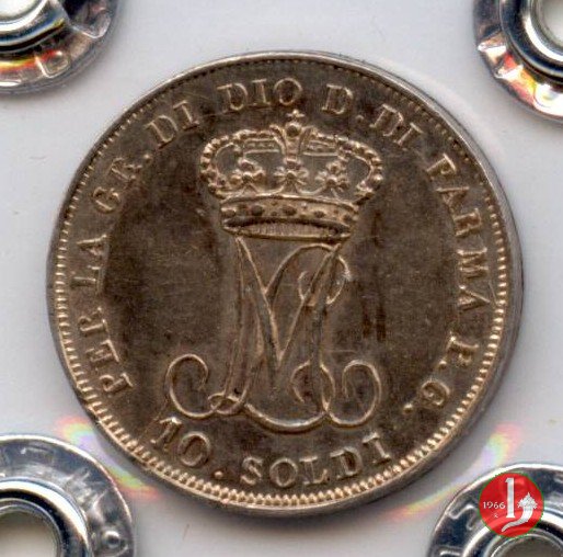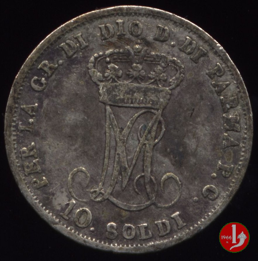 Moneta da 10 soldi, ovvero mezza lira di Parma. Il Ducato di Parma fu il primo stato preunitario a coniare monete utilizzando il sistema decimale, ciononostante per i pezzi da mezza lira ed un quarto di lira fu mantenuta la vecchia dicitura.
