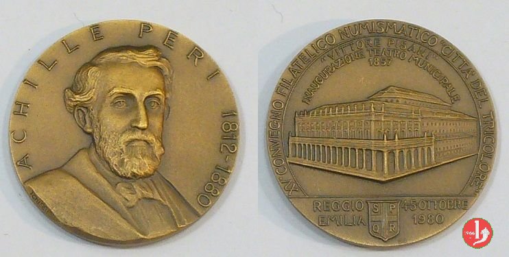 Medaglia coniata, realizzata nel 1980, per ricordare il quindicesimo Congresso Filatelico e Numismatico di Reggio Emilia e il centesimo anniversario della morte di Achille Peri.