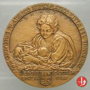 Medaglia coniata, realizzata nel 1983, dallo Stabilimento Stefano Johnson di Milano, per ricordare il diciottesimo Convegno Filatelico e Numismatico di Reggio Emilia e Antonio Allegri, detto il Correggio.