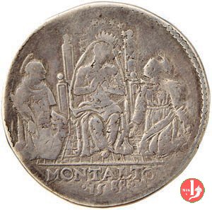 (dal basso a sinistra) •SIXTVS •V •PONT •MAX •ANN •IIII • / Busto a destra a testa nuda, con piviale ornato da due figure e rabeschi; nel giro in basso stella a 5 puntetrepuntistella a 5 punte La Madonna velata e con nimbo di 12 stelle a 5 raggi, seduta di fronte e con mani giunte, fra S. Lorenzo a sinistra e Santa Apollonia a destra nimbati e genuflessi verso di lei. In esergo •MONTALTO •|| •1588 •||