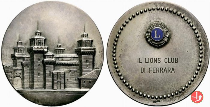 Vista del Castello Estense in Ferrara entro campo perlinato: stemma del Lions Club = IL LIONS CLUB = DI FERRARA