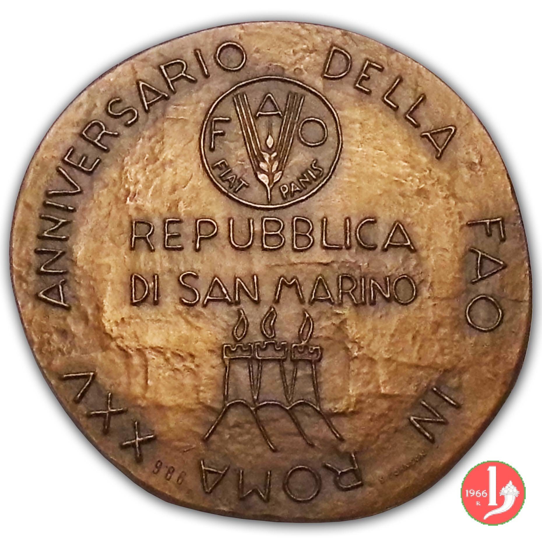 | Medaglia Ufficiale coniata, emessa con Decreto Reggenziale n° 32 del 23-06-1976, con fondo opaco, per celebrare il venticinquesimo anniversario del FAO (Food and Agriculture Organization of the United Nations) a Roma. | ||||||||