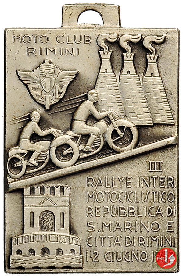 | Placchetta rettangolare coniata, realizzata nel 1952, per ricordare il terzo Rallye Motociclistico Internazionale svoltosi tra San Marino e Rimini. | ||||