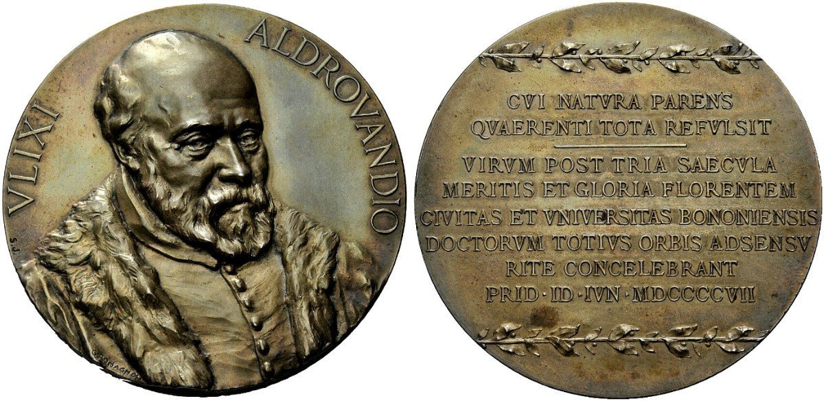 | Medaglia coniata, emessa nel 1907, per ricordare il terzo centenario della morte di Ulisse Aldrovandi (1522-1607) medico e naturalista. | |||||||