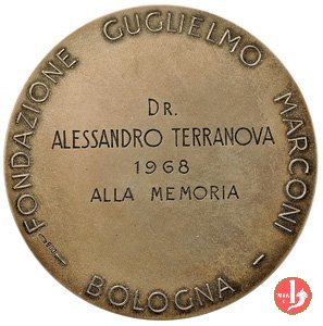 Medaglia coniata, realizzata nel 1965 circa, dallo Stabilimento Stefano Johnson di Milano, per la Fondazione Guglielmo Marconi di Bologna ed utilizzata per ricorrenze della Fondazione Marconi con incisione del campo al Verso: