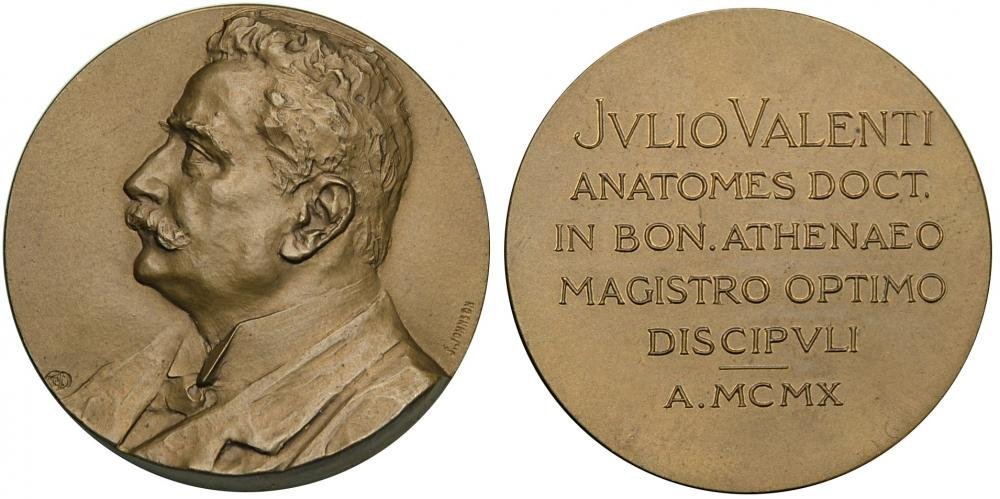 Medaglia coniata, realizzata nel 1910 a ricordo di Giulio Valenti (1860-1933) professore di anatomia all'Università di Bologna.