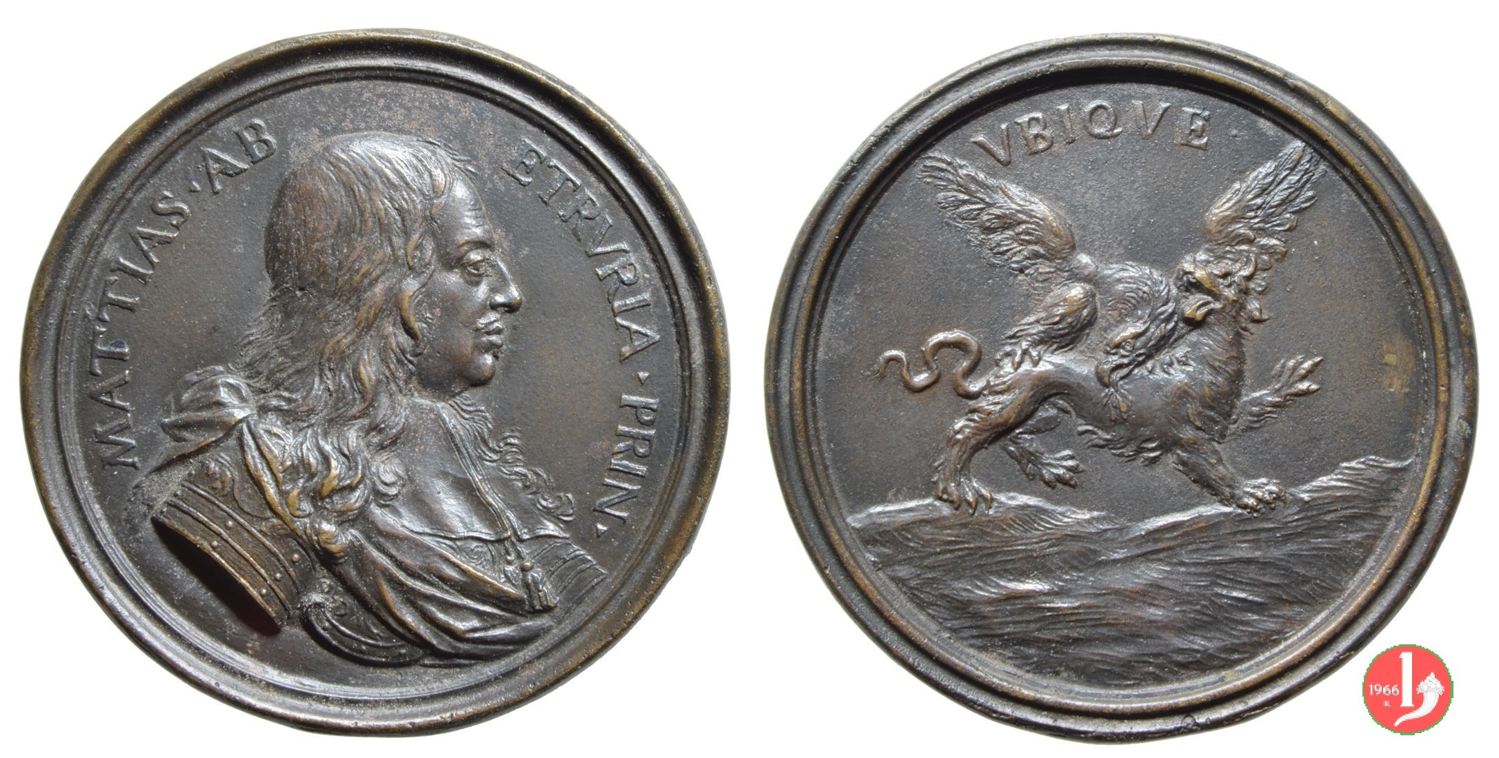 Medaglia fusa, realizzata nel 1712 a ricordo di Mattia de' Medici (1613-1667) era il terzo figlio maschio del Granduca di Toscana Cosimo II e di Maria Antonietta d'Austria. Fu governatore di Siena e combatté nella guerra dei Trent'anni e nella prima Guerra di Castro.