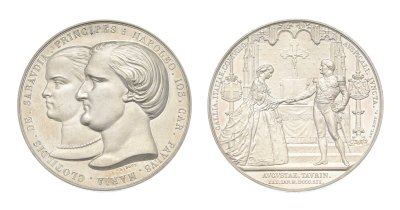 | Medaglia coniata, emessa il 30-01-1859, per ricordare il matrimonio della figlia di Vittorio Emanuele II, Maria Clotilde col principe Napoleone Giuseppe Carlo Paolo Bonaparte (detto Plon-Plon), figlio del re Gerolamo di Westfalia e di Caterina di Württemberg. | |||||