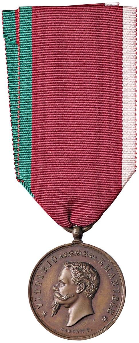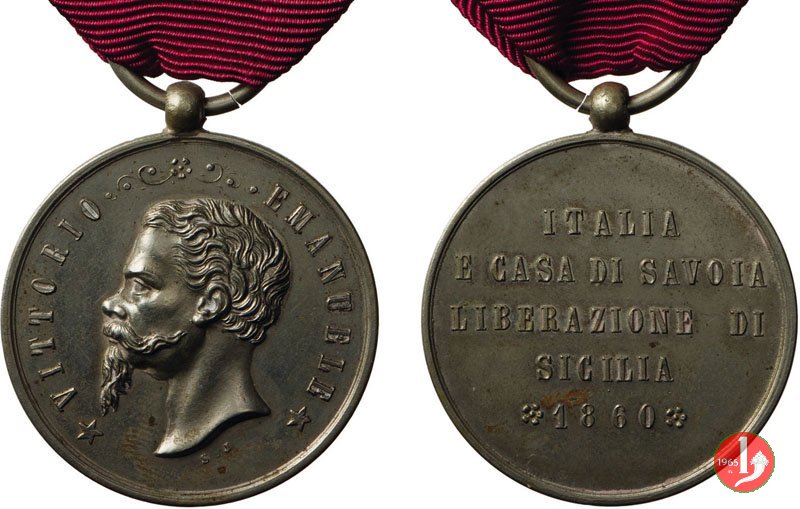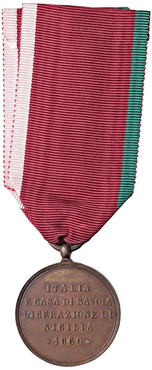 | Medaglia premio coniata, emessa nel 1860 con il decreto n. 10 del 12-12-1859 del senatore conte Massimo Cordero di Montezemolo, luogotenente generale del re nelle province siciliane, fu coniata su progetto di Giuseppe Barone, da attribuirsi a coloro che avevano combattuto in Sicilia, nei metalli Bronzo per tutti i combattenti, argento ai mutilati e invalidi, oro unico esemplare per Garibaldi. | |||||||||||||||