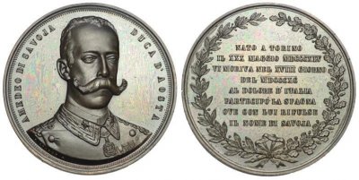 | Medaglia coniata a Firenze, emessa il 18-01-1890, per ricordare la morte del Pricipe Amedeo di Savoia, Duca d'Aosta. | ||||||