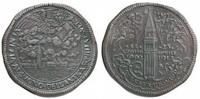 | Medaglia coniata, emessa nel 1912 per celebrare la ricostruzione del campanile di San Marco a Venezia e detta "Osella del Campanile". | |||||