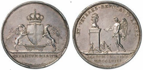 | Medaglia premio coniata, realizzata nel 1823 (con data 1758) per l'Accademia Lingustica di Belle Arti di Genova. | |||||||