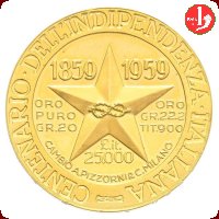 nel campo ai lati di stella a cinque punte contenente nodo d'amore: 1859 _ 1959 = ORO = PURO = G 20 _ ORO = G 22 = TIT 900