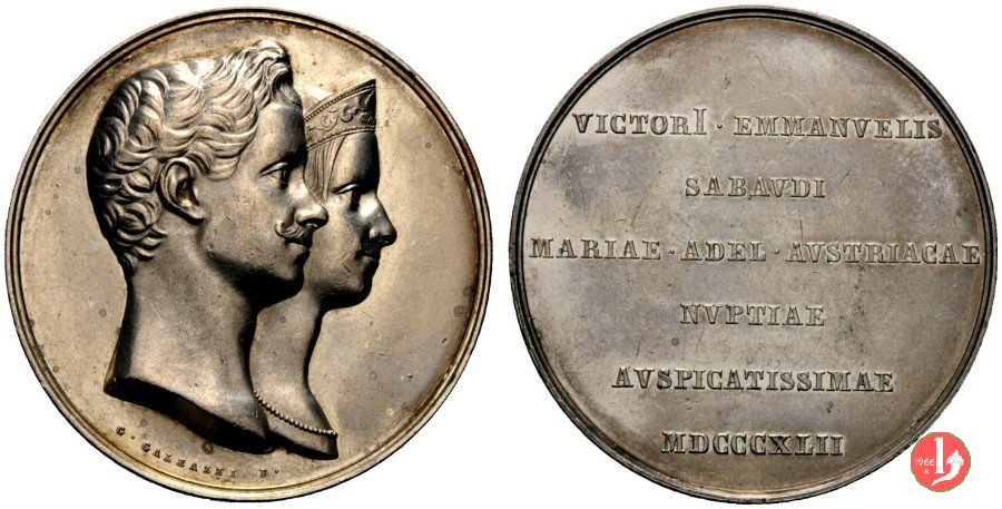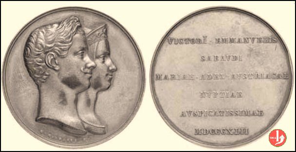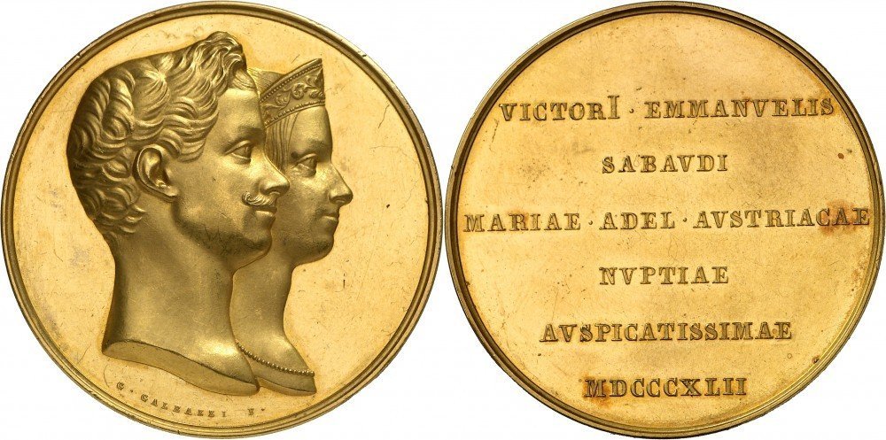 Medaglia coniata, emessa a ricordo del Matrimonio di Vittorio Emanuele II e Maria Adelaide d'Asburgo-Lorena celebrato a Stupinigi (presso Torino) il 12-04-1842.