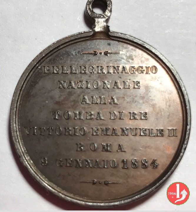 | Medaglia coniata, realizzata nel 1884 per ricordare il Pellegrinaggio Nazionale alla Tomba di re Vittorio Emanuele II a Pantheon. | |||