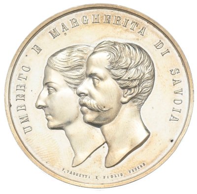 Medaglia coniata, emessa il 30-04-1868, per ricordare le nozze di Umberto e Margherita. | ||||||