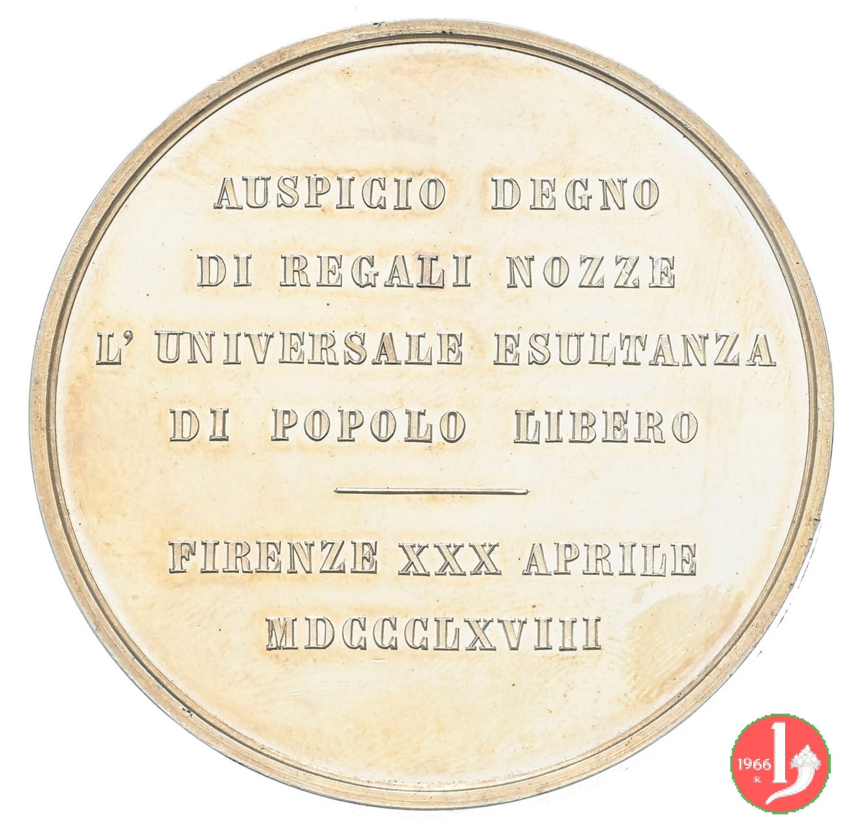 nel campo: AUSPICIO DEGNO = DI REGALI NOZZE = L'UNIVERSALE ESULTANZA = DI POPOLO LIBERO = - = FIRENZE XXX APRILE = MDCCCLXVIII