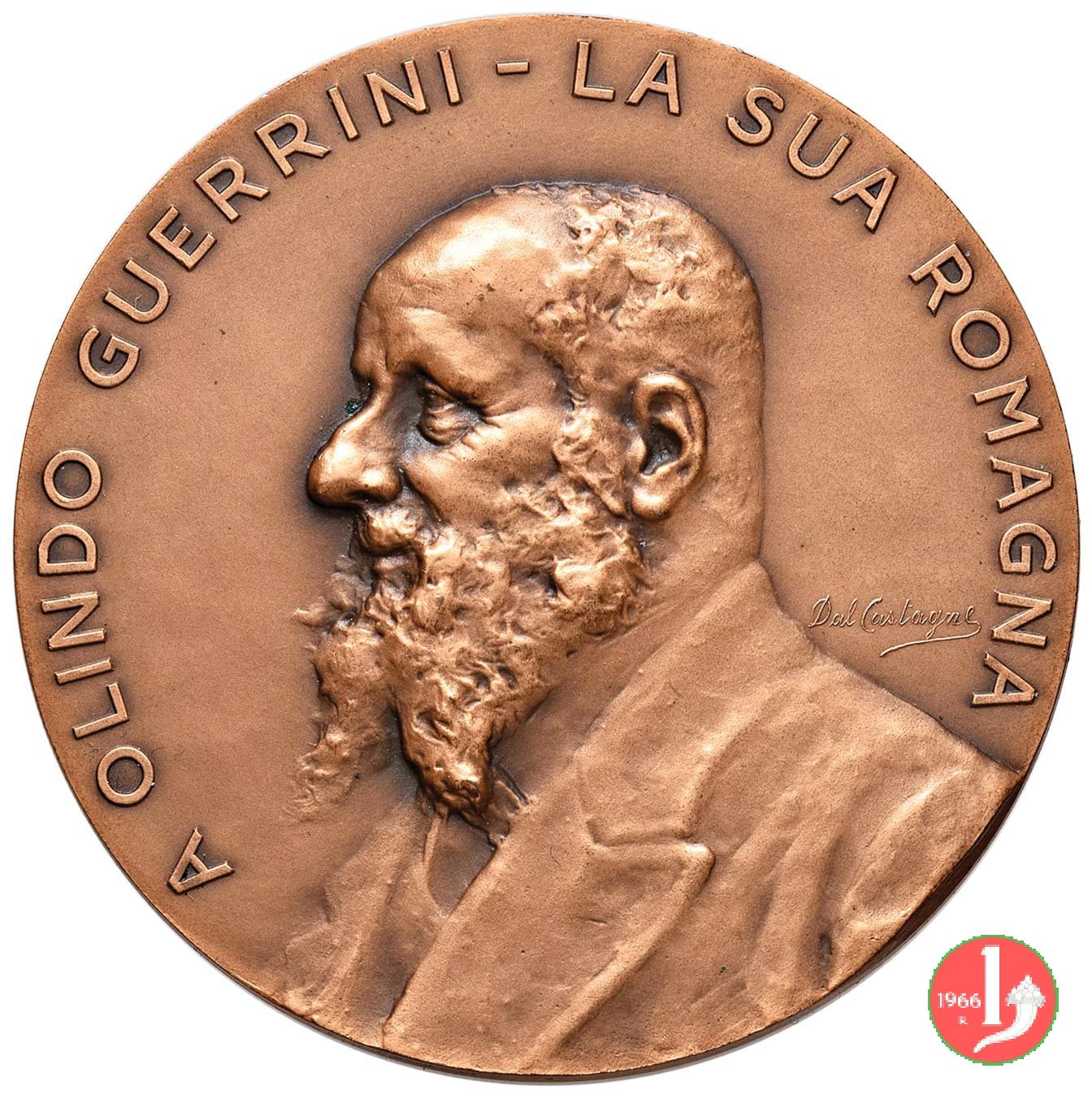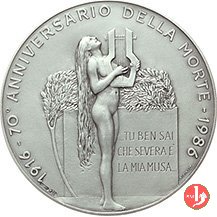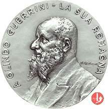 | Medaglia coniata, realizzata nel 1986, con l'utilizzo del conio del Dritto modificato ma realizzato nel 1916 da Albino Dal Castagnè, emessa per celebrare il settantesimo anniversario della morte di Olindo Guerrini (1845-1916) poeta e scrittore. | |||||