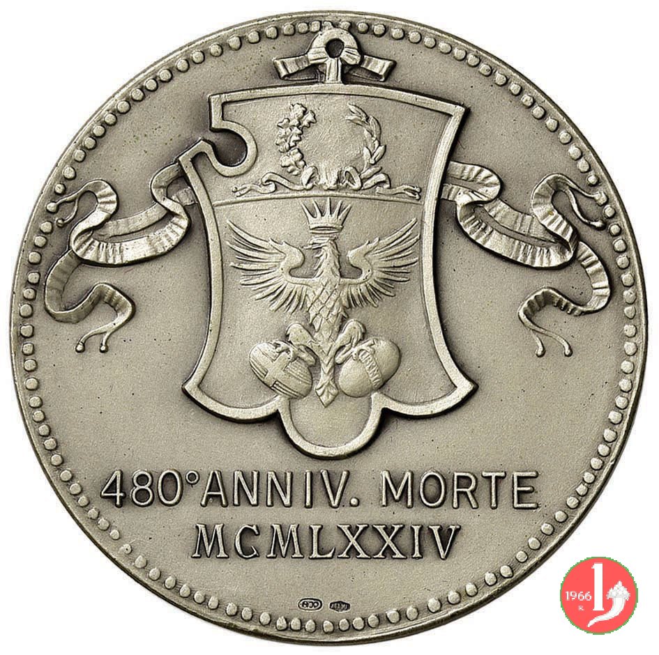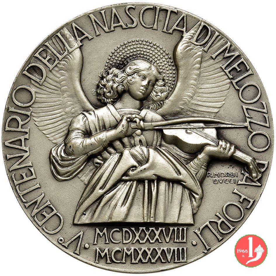 | Medaglia coniata, realizzata nel 1974, con fondo opaco o satinato dallo Stabilimento F.lli Lorioli di Milano, per il Circolo Filatelico Numismatico Forlivese, a ricordo di Melozzo da Forlí (1438-1894) pittore e architetto, nel quattrocentottantesimo anniversario della morte. | |||||||