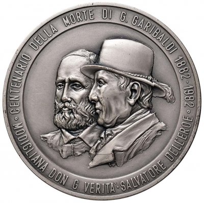 Medaglia coniata, realizzata nel 1982 dal Circolo Filatelico e Numismatico di Modigliana, per ricordare il centenario della morte di Giuseppe Garibaldi. | ||||