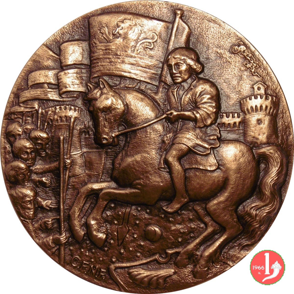 Medaglia coniata, realizzata nel 2016 dallo stabilimento Picchiani e Barlacchi di Firenze per il Circolo Filatelico Numismatico Forlivese, a ricordo del cinquecentocinquantesimo anniversario della morte di Francesco III Ordelaffi (1435-1466), Signore di Forlí. | |||||||