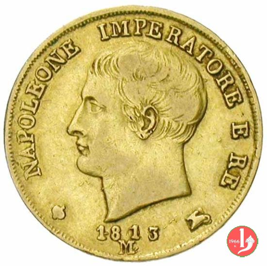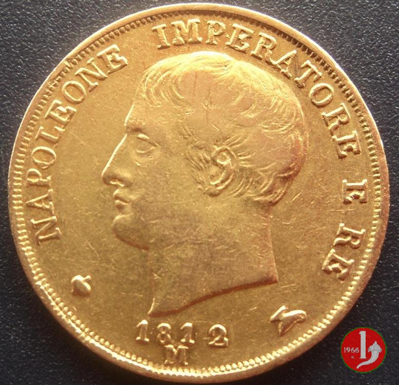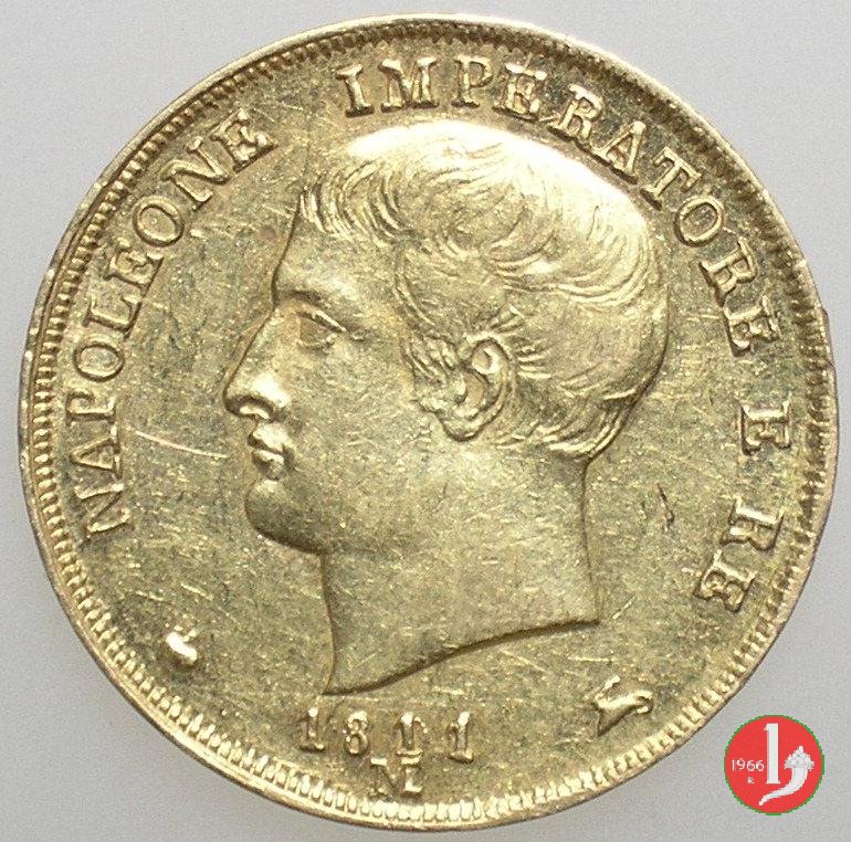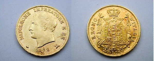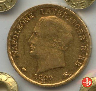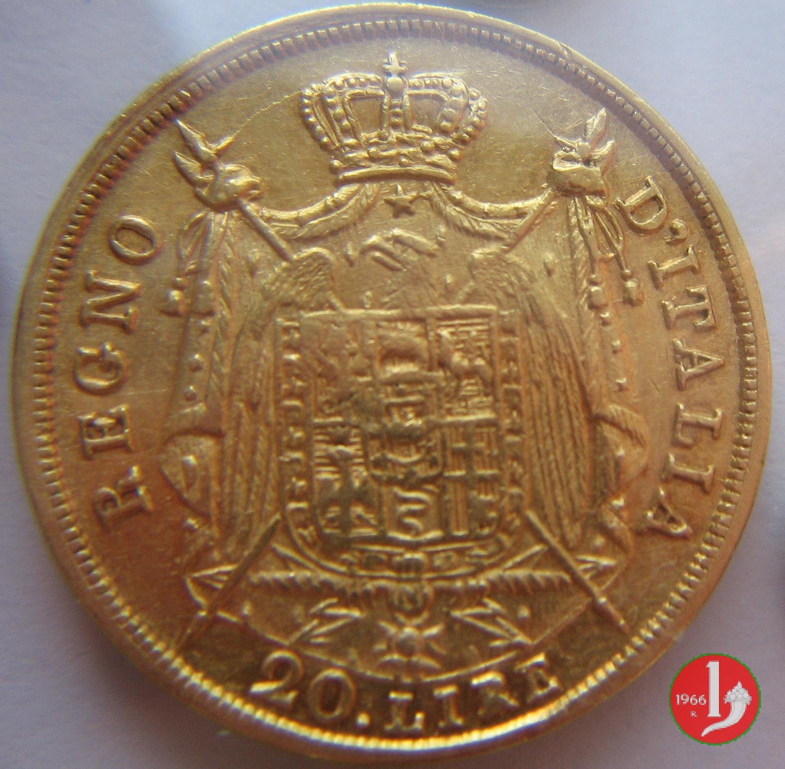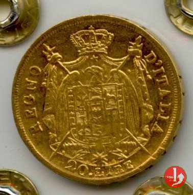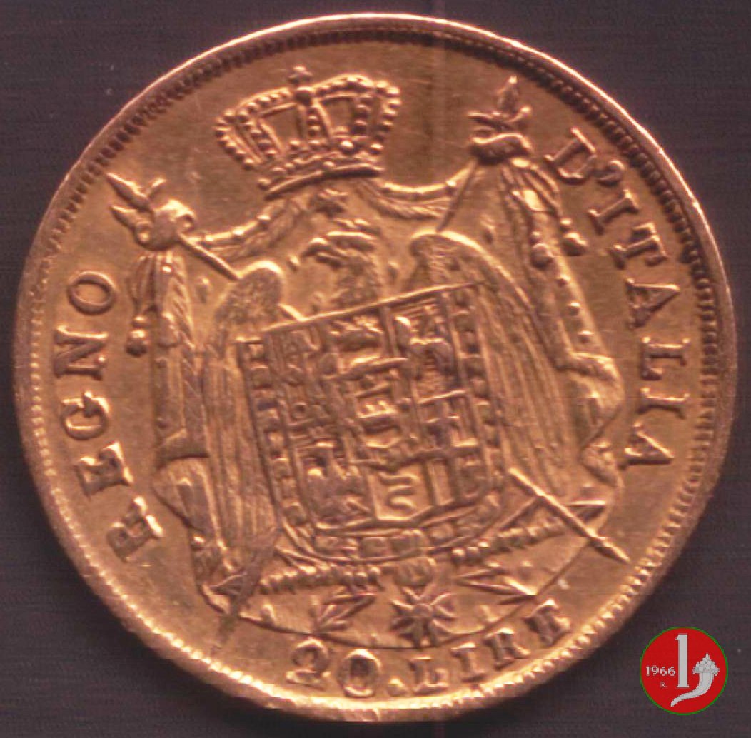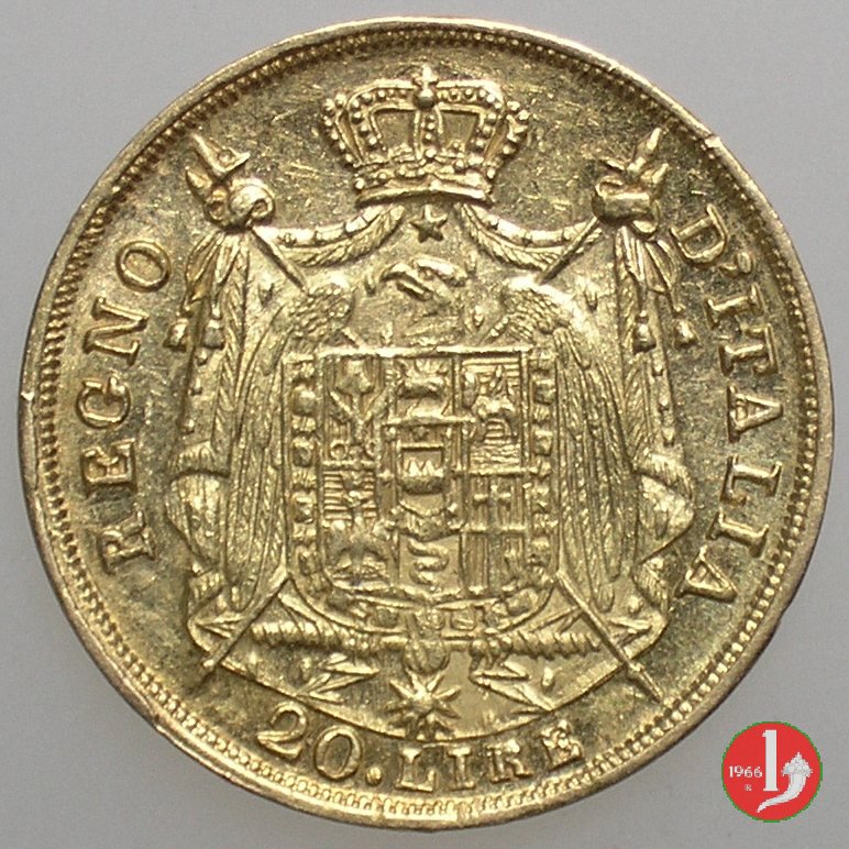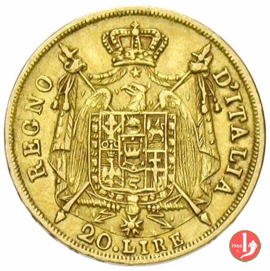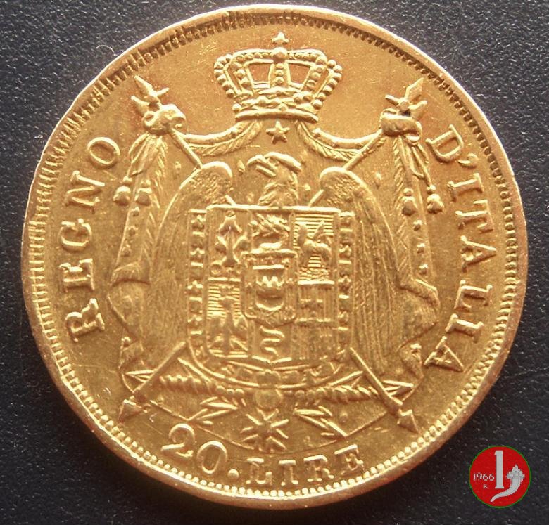 melagrana NAPOLEONE IMPERATORE E RE lume ad olio testa nuda a sinistra. In basso, data e sotto segno di zecca (M).1  REGNO D'ITALIA, stemma su padiglione coronato, con alabarde decussate ed aquila volta a sinistra ad ali spiegate. Lo stemma è compreso nel collare della Legion d'Onore. In basso, nel giro, 20.LIRE2