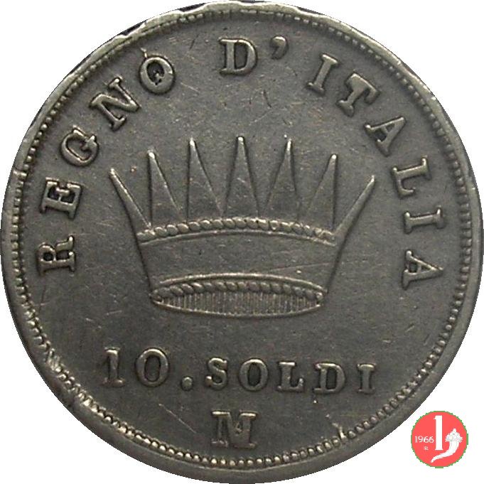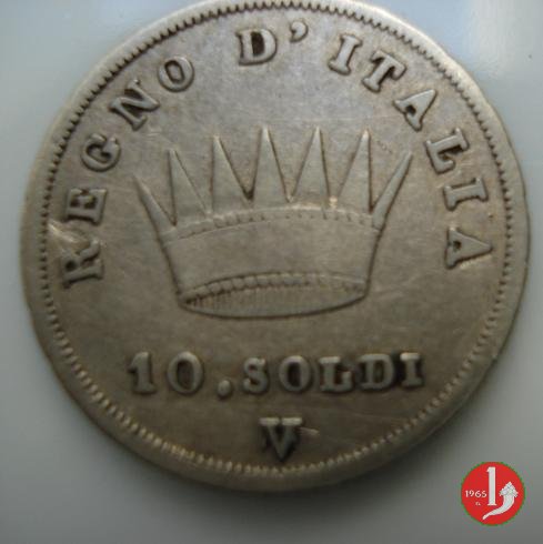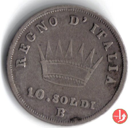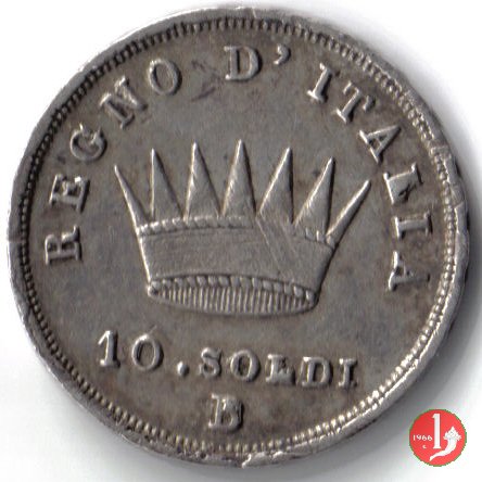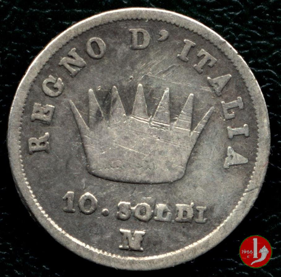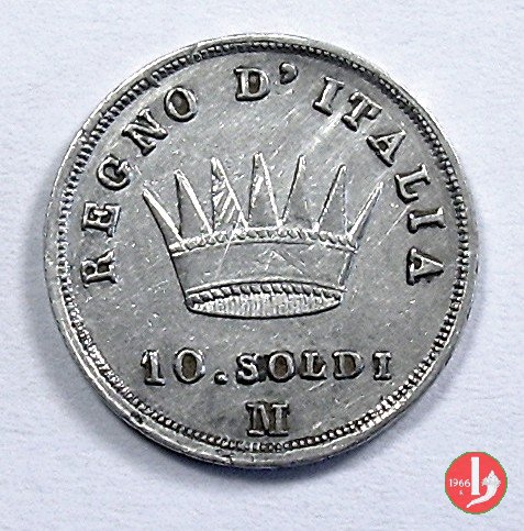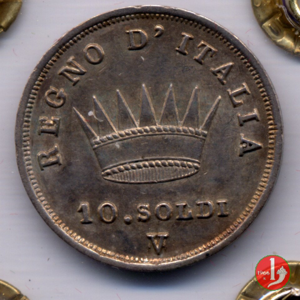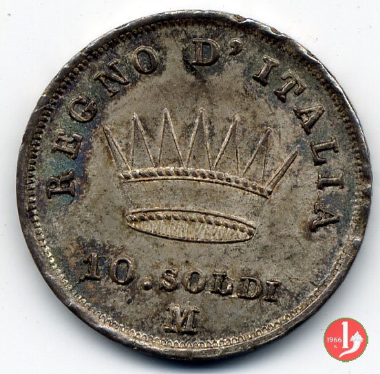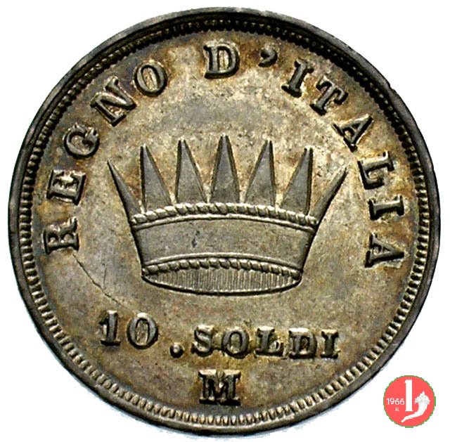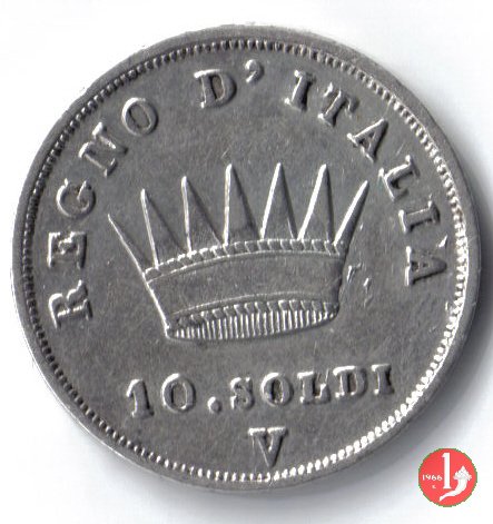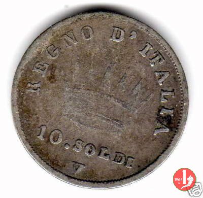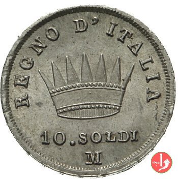 Moneta da 10 soldi ovvero 50 centesimi di lira. Segno di Zecca per Bologna: B e ramoscello di quercia Segno di Zecca per Milano: M e melagrana Segno di Zecca per Venezia: V e un'ancora. | |||||||||||||||||||||||