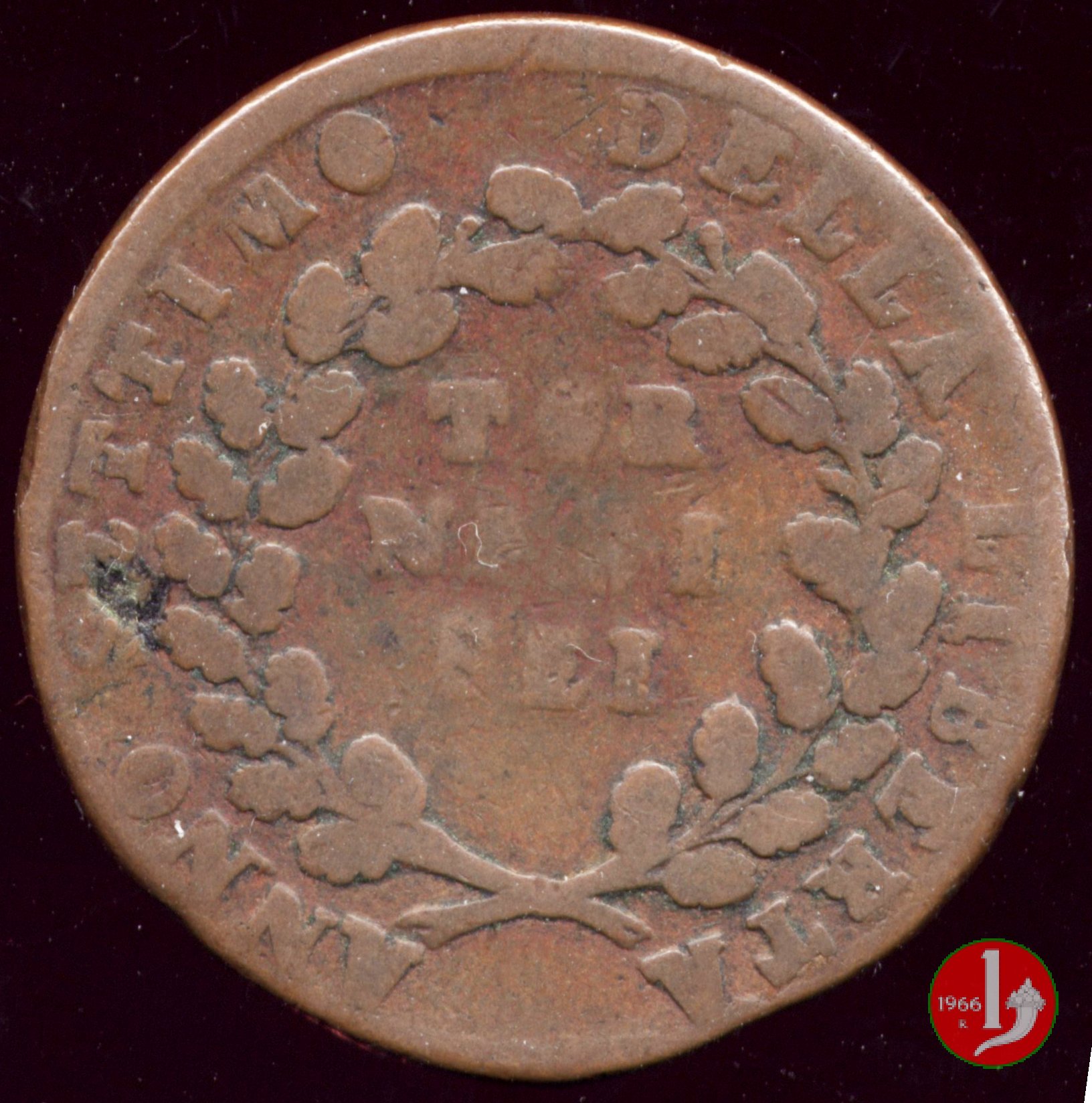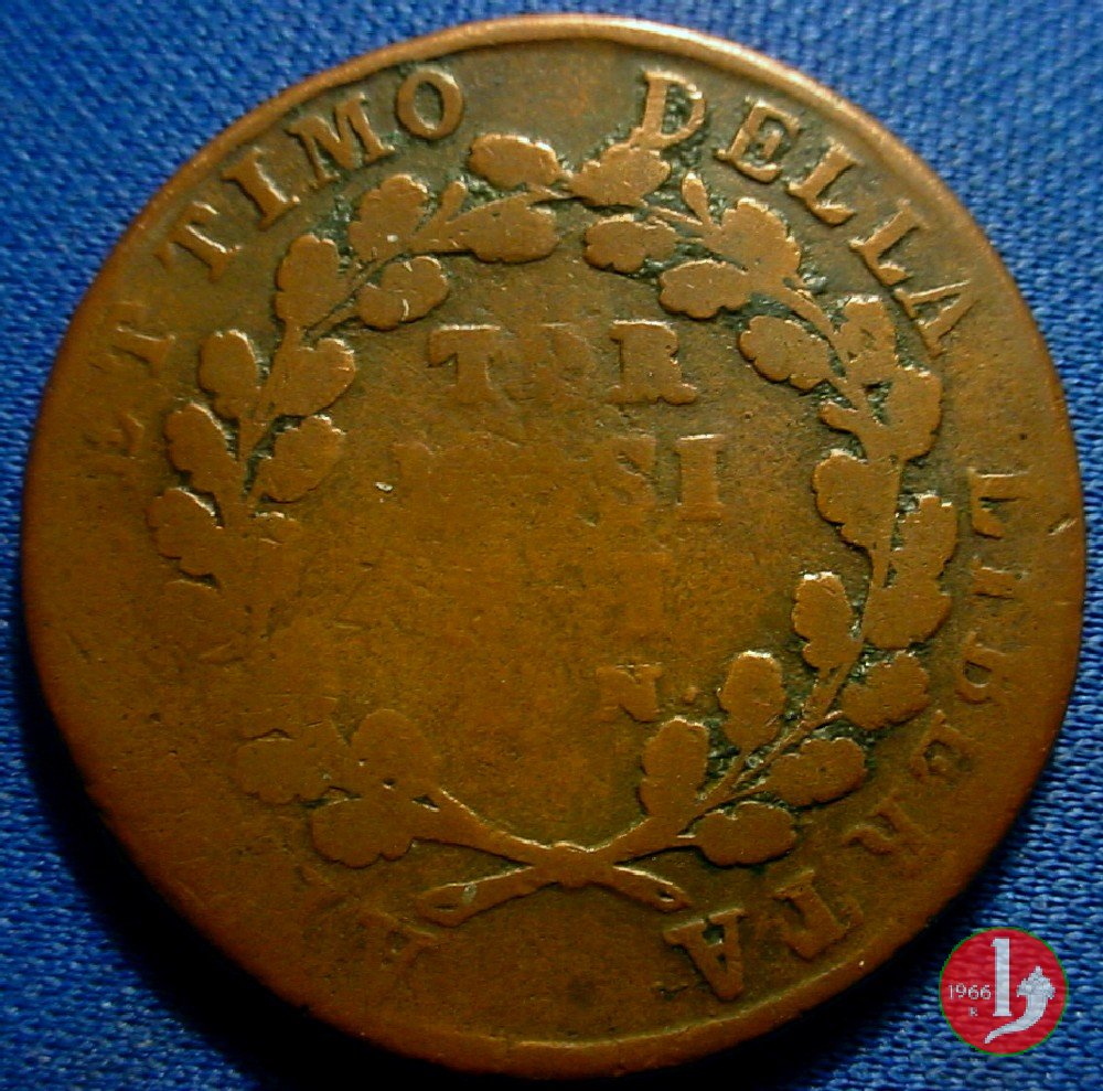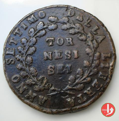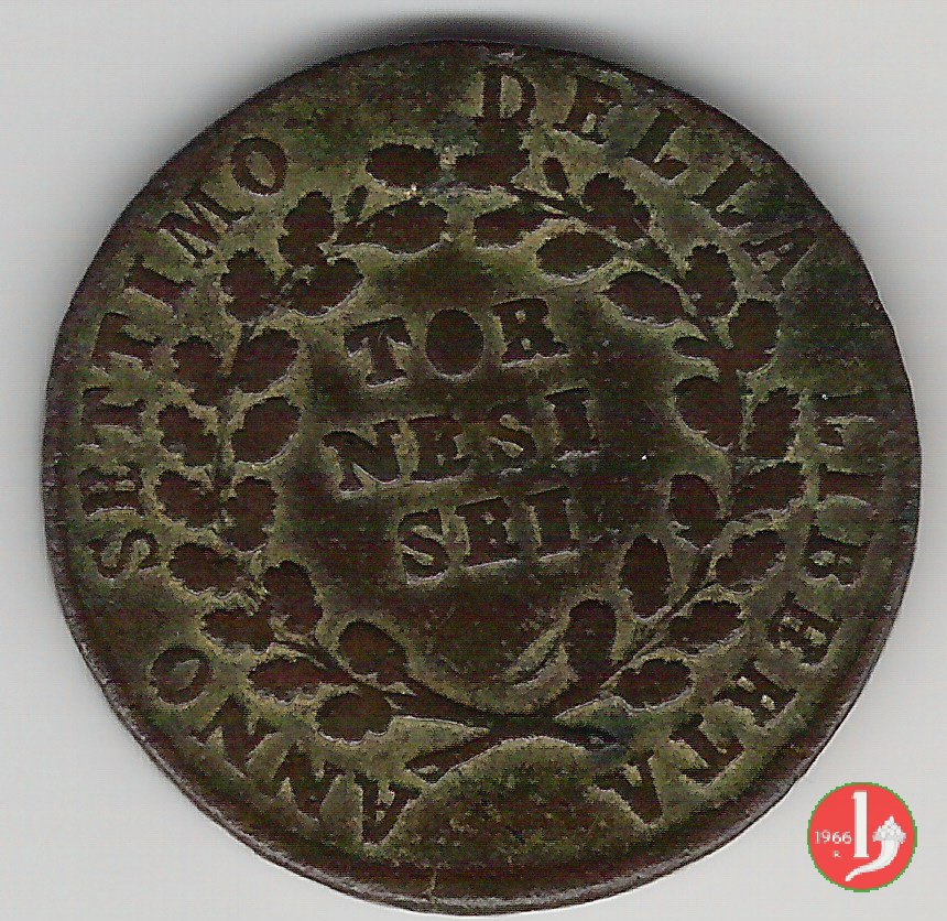 REPUBBLICA NAPOLITANA , nel campo fascio con scure a destra sormontato da berretto frigio.1  ANNO SETTIMO DELLA LIBERTÀ Nel campo su tre righe TOR/NESI/SEI tra due rami di quercia.