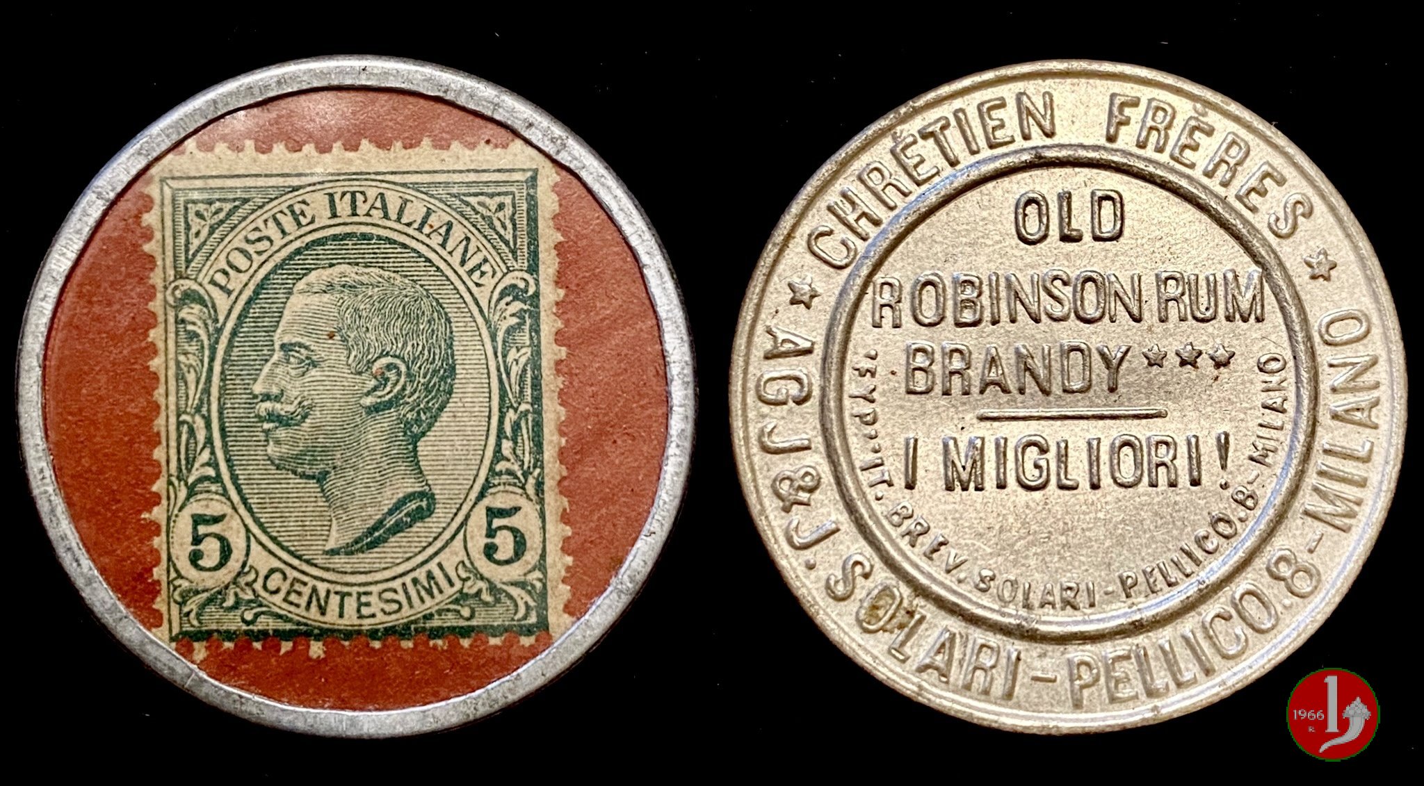 Francobollo incapsulato all'interno del tondello in alluminio, protetto da una pellicola di celluloide. Nel giro sopra stella a 5 punte CHRETIEN FRERES stella a 5 punte