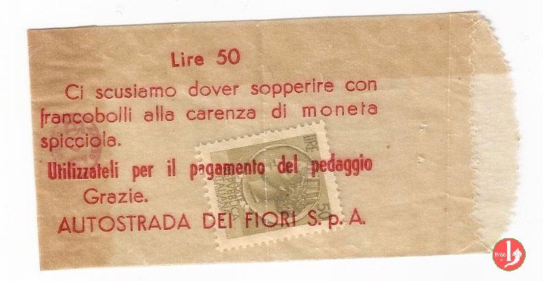 Francobolli per il valore di XXX Lire "Ci scusiamo dover sopperire con francobolli alla carenza di moneta spicciola. Utilizzateli per il pagamento del pedaggio. Grazie. Autostrada Dei Fiori S.p.a."