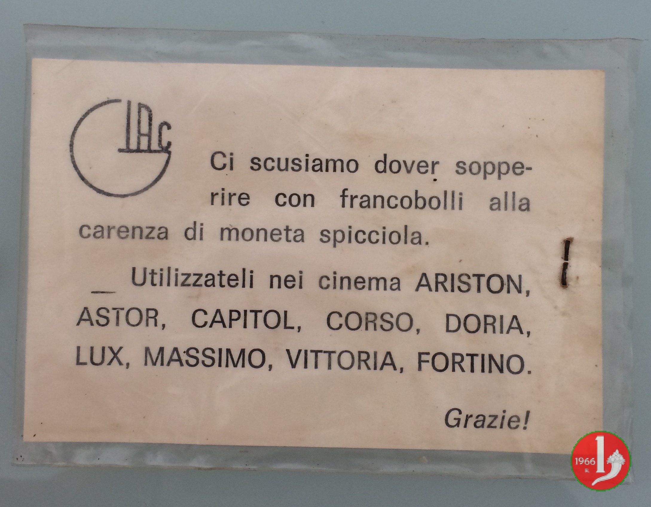 Francobolli per il valore di XXX Lire "Ci scusiamo dover sopperire con francobolli alla carenza di moneta spicciola. Utilizzateli nei cinema"