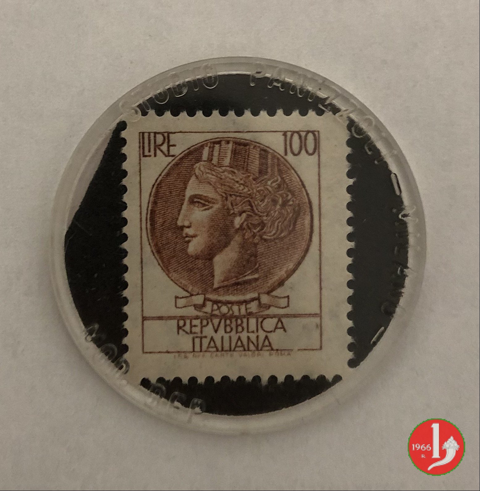 Marchio STUDIO PANIZZOLI - MILANO MOD. DEP. su plastica trasparente. Francobollo di vari valori serie siracusana. Pubblicità Oreficeria P.Coltelli