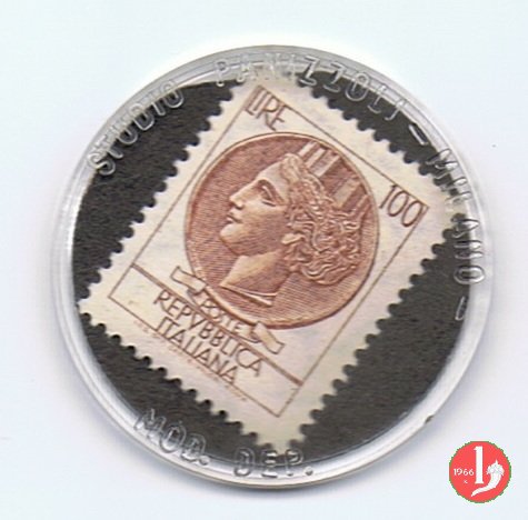 Marchio STUDIO PANIZZOLI - MILANO MOD. DEP. su plastica trasparente. Francobollo di vari valori serie siracusana. Pubblicità Innocenti Comm. Spa