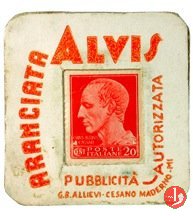Cartoncino con francobollo protetto da plastichina trasparente. Disposto intorno da sinistra: ARANCIATA ALVIS - PUBBLICITA' AUTORIZZATA G.B. ALLIEVI • CESANO MADERNO • MI su 4 righe il motto "E piú la bevi e piú la trovi buona ALVIS"