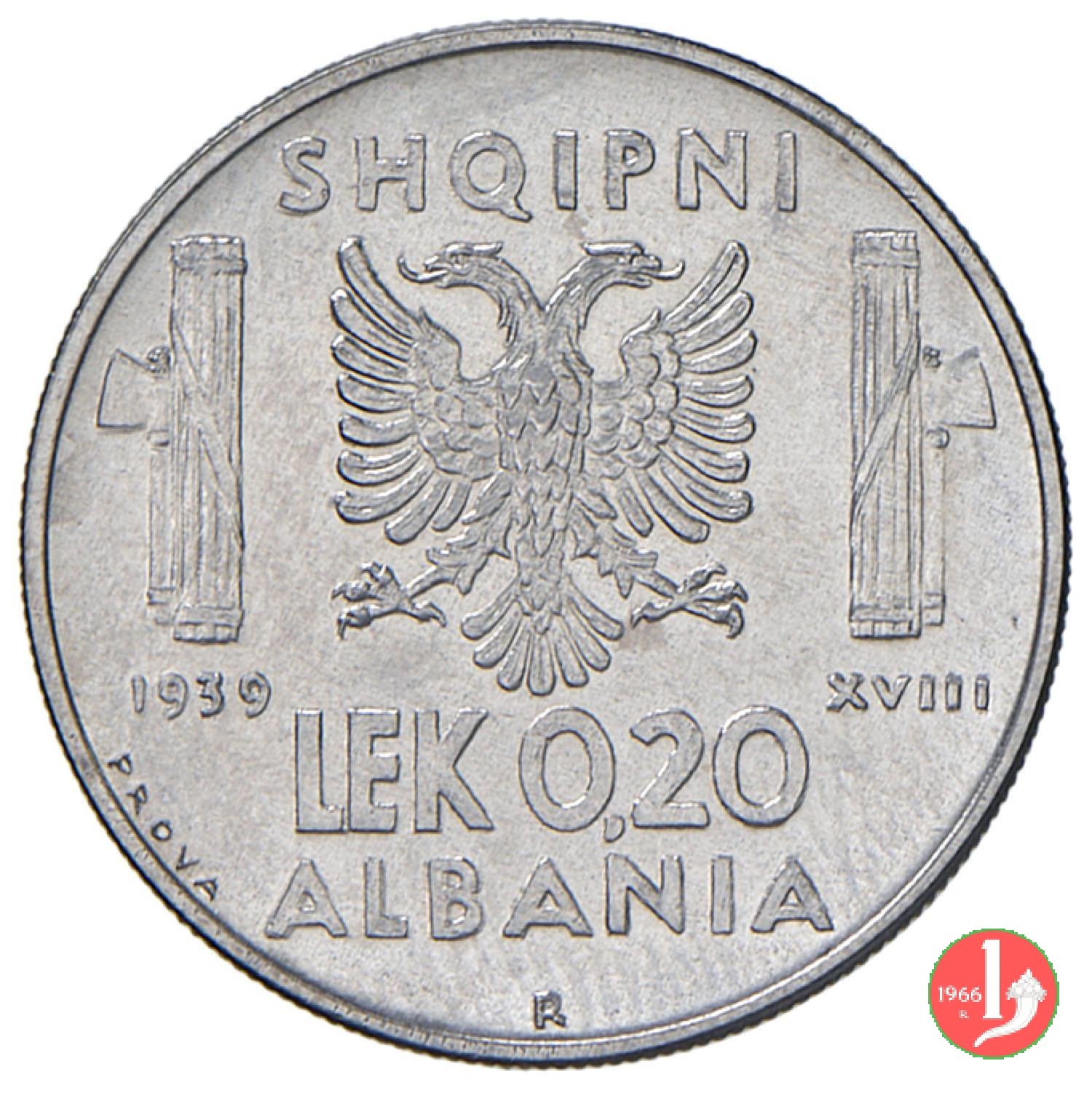 Semibusto in uniforme ed elmato del Re volto a destra. Intorno la scritta VITT EM III RE E IMP MBRET E PER • Sotto il collo del Re, lungo il bordo, il nome dell'autore (G. ROMAGNOLI). Aquila bicipite albanese contornata da due fasci con le scuri verso l'esterno. Sotto il fascio di sinistra, il millesimo, sotto quello di destra, l'anno dell'Era Fascista. In alto SHQIPNI, sotto, indicazione del valore (LEK 0,20) e ALBANIA su due righe. A ore 6 il segno di zecca. In basso. a sinistra, circolarmente "PROVA".