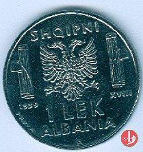 Semibusto in uniforme ed elmato del Re volto a destra. Intorno la scritta VITT EM III RE E IMP MBRET E PER • Sotto il collo del Re, lungo il bordo, il nome dell'autore (G. ROMAGNOLI). Aquila bicipite albanese contornata da due fasci con le scuri verso l'esterno. Sotto il fascio di sinistra, il millesimo, sotto quello di destra, l'anno dell'Era Fascista. In alto SHQIPNI, sotto, indicazione del valore (1 LEK) e ALBANIA su due righe. A ore 6 il segno di zecca. Circolarmente, in basso, a sinistra, "PROVA".