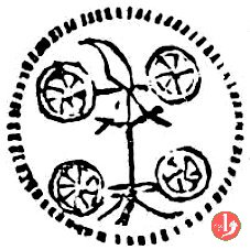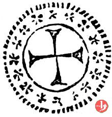 Carro in campo libero, contorno perlinato. Croce patente in circolo, attorno rosette, contorno perlinato.