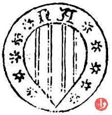 cimiero con a destra tre F e sinistra due F, a ciascun lato della testa F. Scudo a forma di goccia, attorno rosette e le iniziali N F.