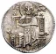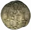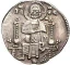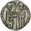 San Marco stante a destra, di fronte, tiene nella sinistra il libro dei Vangeli e con la destra porge il vessillo al Doge stante a sinistra, di fronte. La banderuola con la croce è volta a sinistra.
