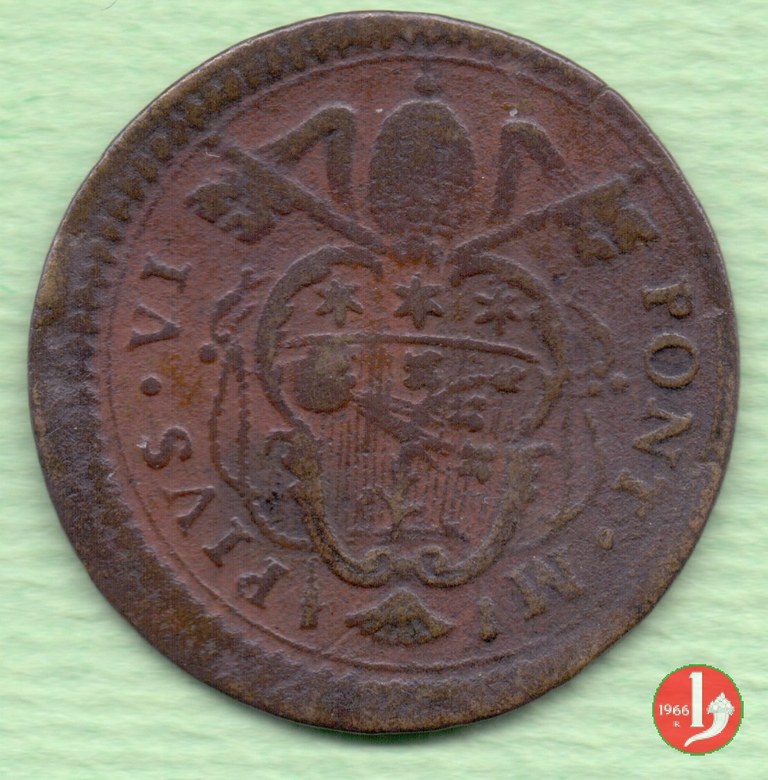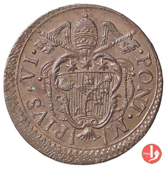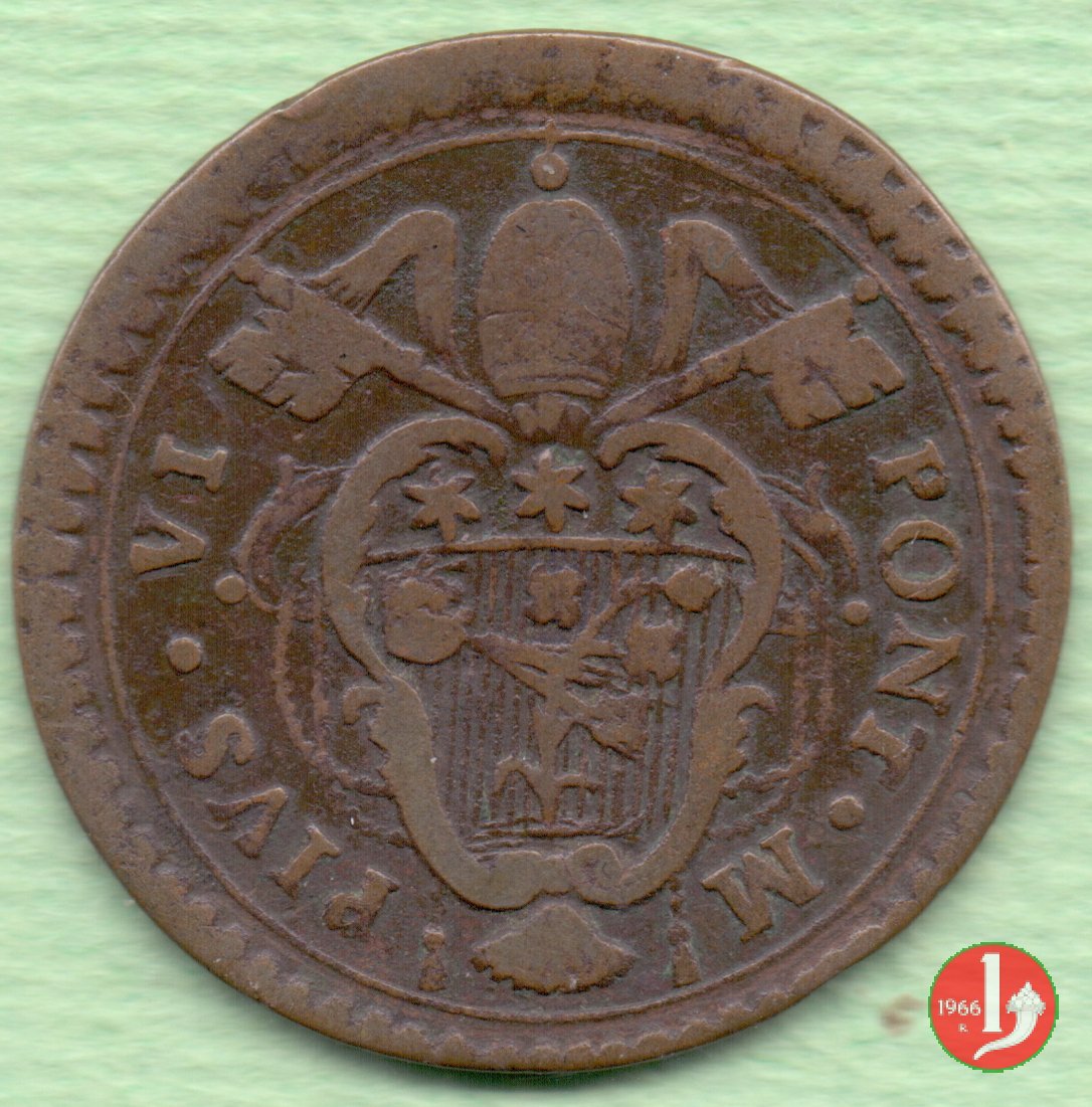 2 Dritto: stemma a targa in cornice, chiavi con impugnatura ovale con fiocchi; (s) • PIVS • VI • - PONT • M • // Rovescio: come 1778 // (Muntoni 280)