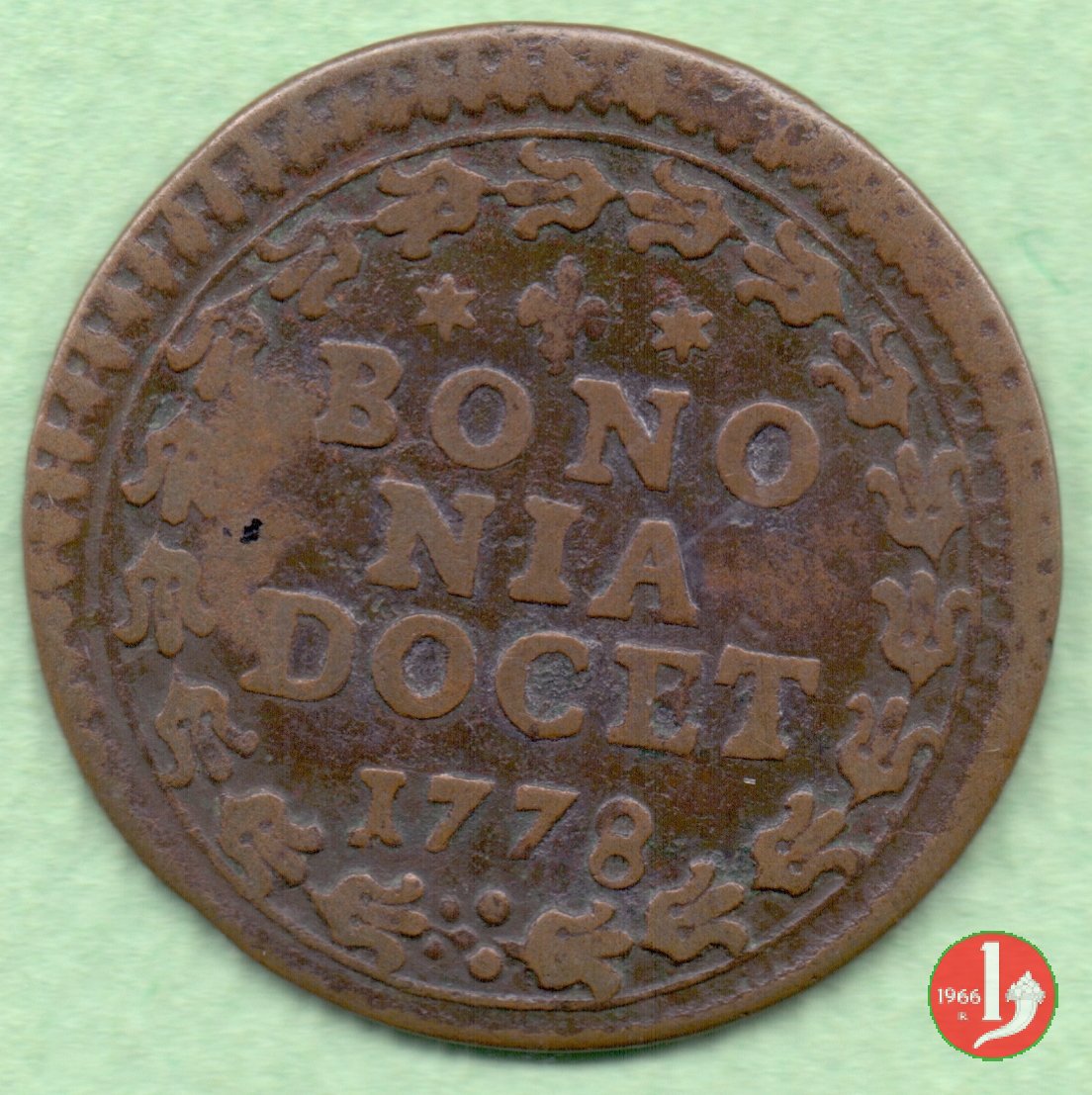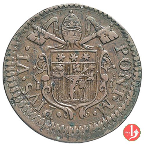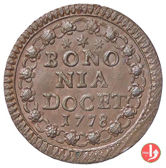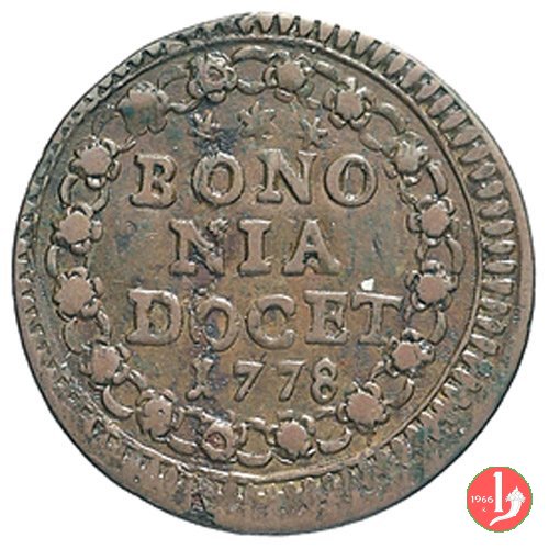 1 Dritto: stemma a cuore in cornice di fogliami, conchiglia in basso; chiavi con impugnatura ovale, doppi cordoni e fiocchi in basso; (s) PIVS • VI - PONT • M // Rovescio: * * * || BONO || NIA || DOCET || 1778 in ghirlanda di rosette e anelli // (Muntoni 279)