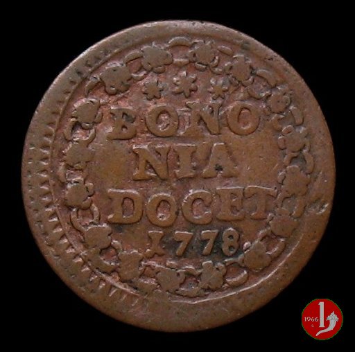 9 Dritto: stemma trilobato piccolo in cornice, chiavi con impugnatura ovale e fiocchi; (s) * PIVS • VI - PONT • M * // Rovescio: * * * || BONO || NIA || DOCET || 1778 in cornice circolare a greca // (Muntoni 284)