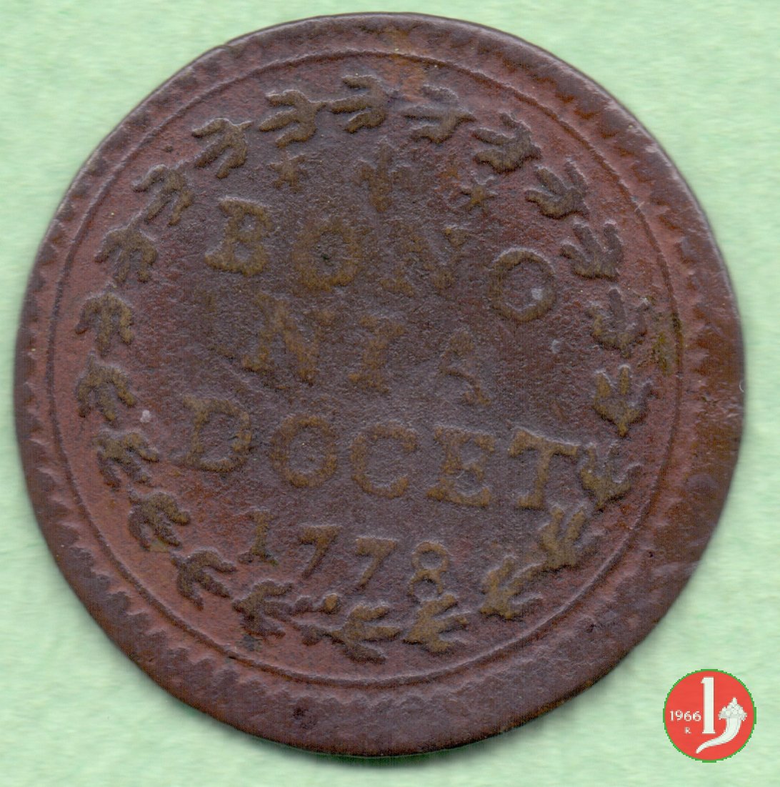 10 Dritto: come 1778 e // Rovescio: foglia tra due stelle || BONO || NIA || DOCET || 1778 in cerchio di meandri // (Muntoni 285)