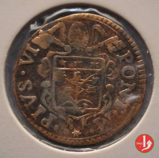 9 Dritto: stemma a targa in cornice, chiavi con impugnatura ovale sciolte; in basso: conchiglia; (s) • PIVS • VI - PONT • M • // Rovescio: * * * || BONO || * NIA || * DOCET || 1784 || * in ghirlanda sinistrorsa di fiordalisi // (Muntoni 299)