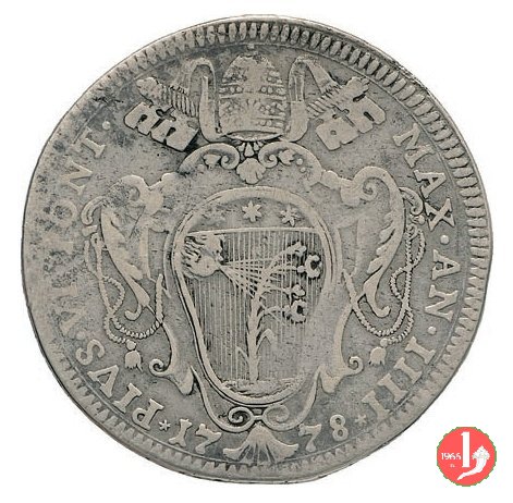 Stemma di Pio VI ovale in cornice, chiavi con impugnatura ovale con cordoni e fiocchi; inizio della leggenda da sinistra in basso: * PIVS • VI • PONT • - MAX • AN • anno pontificato * ; in basso: 17 - 78 San Petronio seduto a sinistra su nubi; a sinistra le due torri; in basso a sinistra armetta Boncompagni, a destra armetta Bologna; inizio della leggenda da sinistra in basso: S • PETRONIVS • - BONONIAE • PROT • ; in basso: iniziali dell'incisore - 50