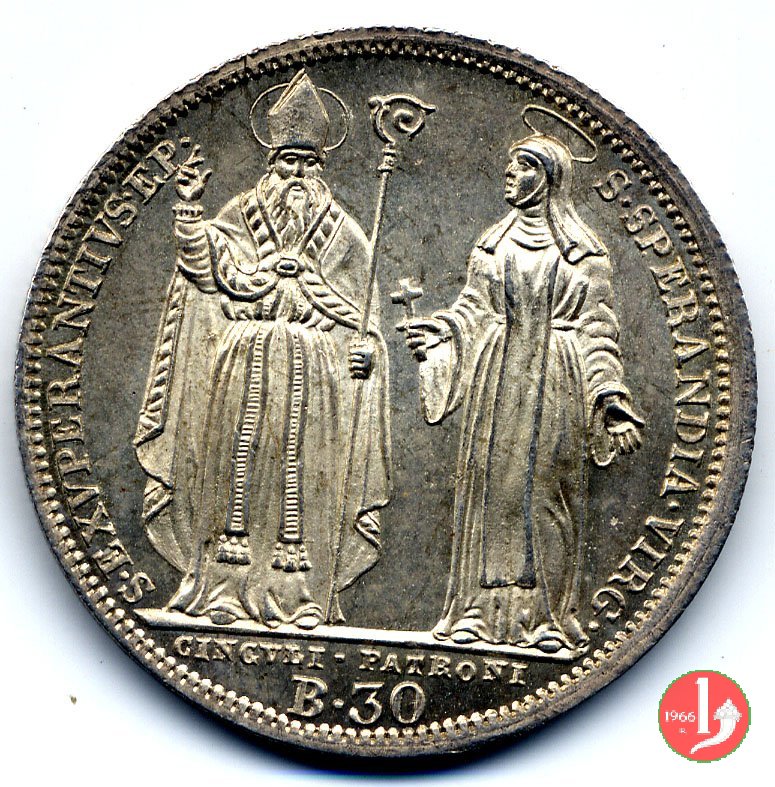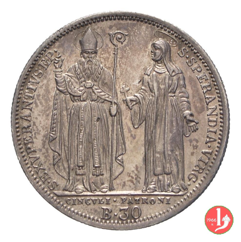 Busto a destra con zucchetto, mozzetta e stola; attorno: PIVS • VIII • PON • - MAX • ANNO • II; sotto, la data tra ROM • e N.C. I santi stanti e affiancati; attorno: S • EXVPERANTIVS • EP • - S • SPERANDIA • VIRG •; nell'esergo il valore e: CINGVLI • PATRONI.