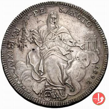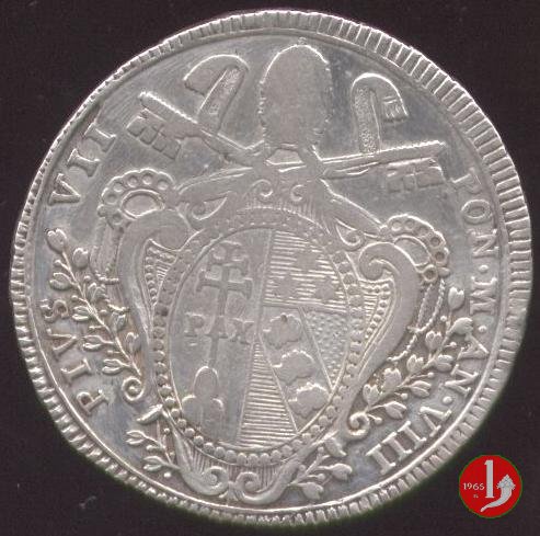 Stemma ovale in cornice con trifoglio sopra tra due rami d'alloro, sormontato da tiara e chiavi decussate con impugnatura ovale e doppi cordoni; attorno, da sinistra in b.: PIVS VII - PON • M • AN • (anno di pontificato). La Chiesa seduta sulle nubi, reggente chiavi e tempio; attorno: AVXILIVM - DE - SANCTO - data; sotto a sinistra, la firma dell'incisore G HAMERANI (Giovanni Hamerani); in basso, armetta cardinalizia del Card. Lante, presidente delle zecche (tre aquile).1